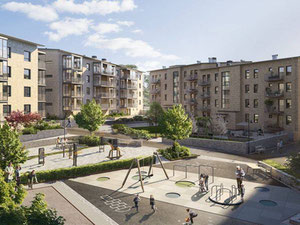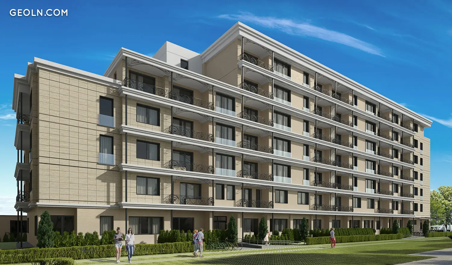 تم التخطيط لبناء مبنيين: أحدهما على شكل حرف T ، ويقع في الجزء الشمالي الغربي من العقار ويحتوي على مدخلين "أ" و "ب" ، والآخر يقع في وسط العقار ويحتوي على مدخلين "ب" و "د". ". على الحدود الشمالية الشرقية للعقار مبنى من طابق واحد مع سبعة استوديوهات.