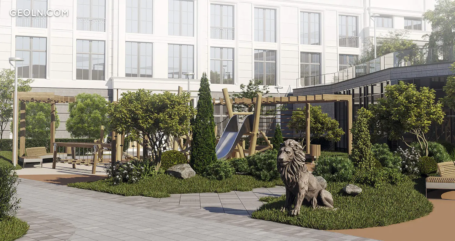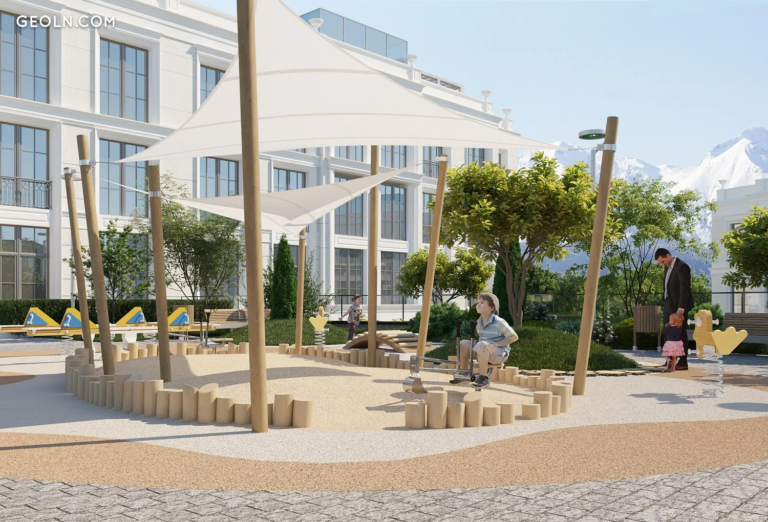 من ناحية أخرى ، تم تصميم المناظر الطبيعية للفناء من أجل التسلية النشطة بفضل وجود ملاعب حديثة على المستوى الأوروبي ومسارات للركض ومناطق WorkOut ، ومن ناحية أخرى ، فهي تؤهلك للاسترخاء الهادئ. تضيف التحوط ، وهي بركة تحتوي على الكارب الذهبي وأنواع نباتية نادرة ومنزلقات جبال الألب ، إلى جو الوحدة مع الطبيعة.
