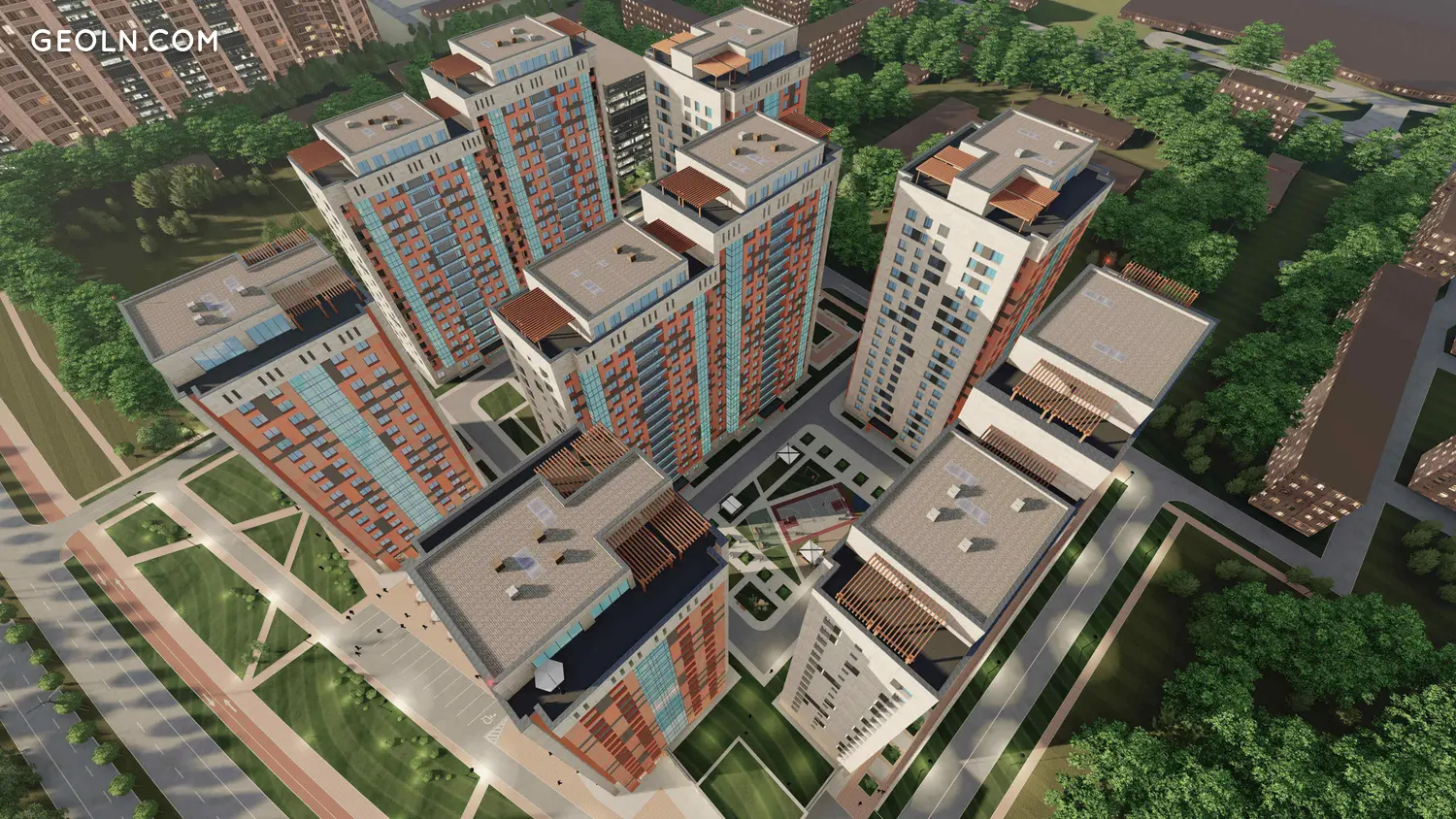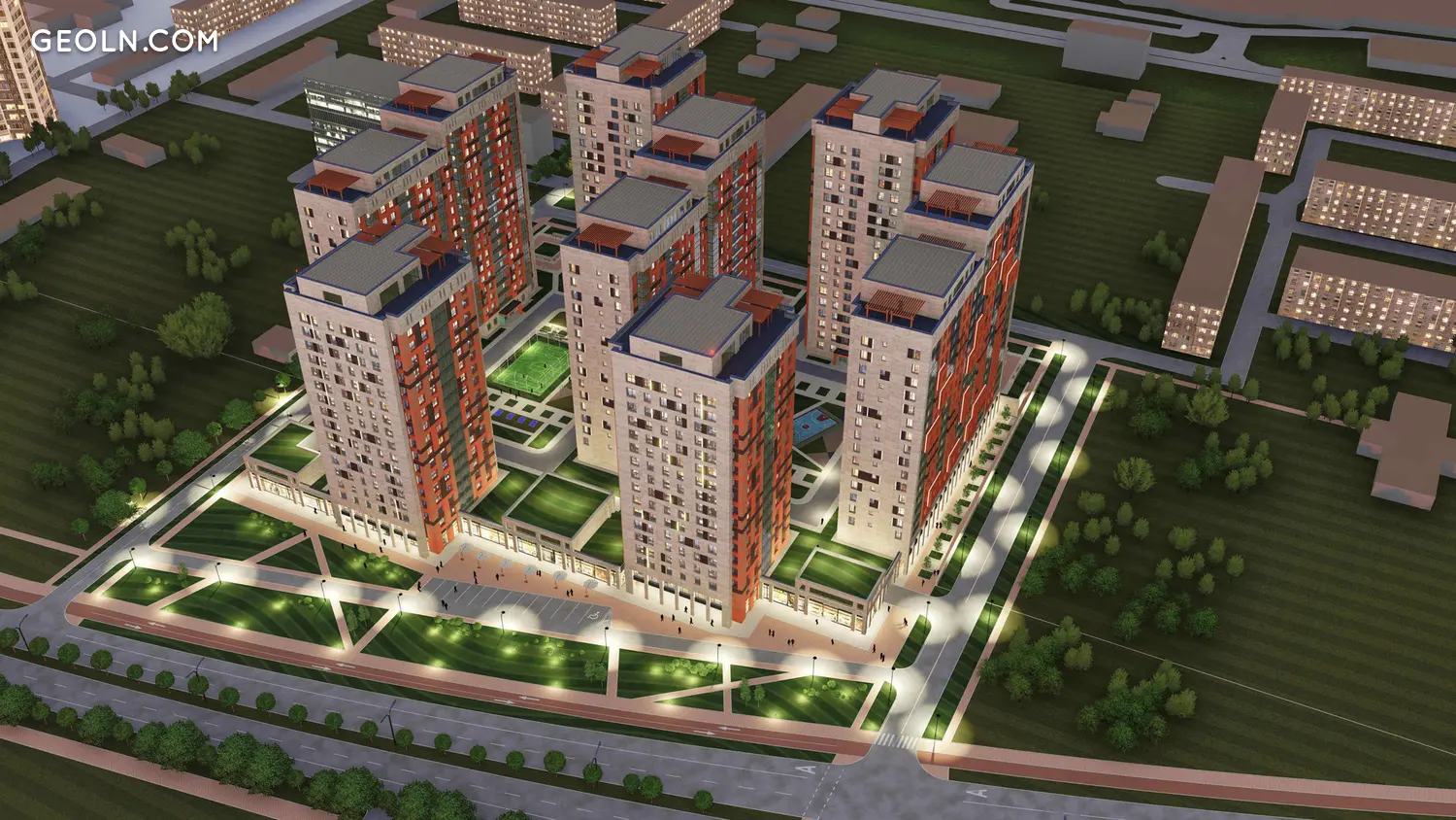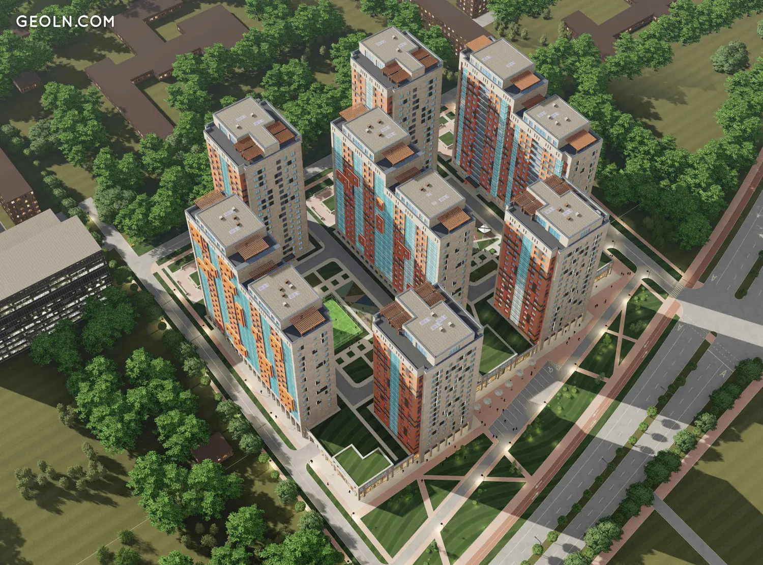 المباني تشكل ساحات مغلقة. الأراضي المجاورة لها مناظر طبيعية بالكامل. تم وضع ممرات واسعة للمركبات الخاصة ومسارات المشي المبطنة بألواح الرصف بالقرب من المنازل. يجري تركيب تركيبات إنارة الشوارع.