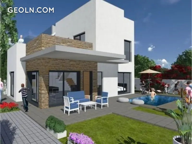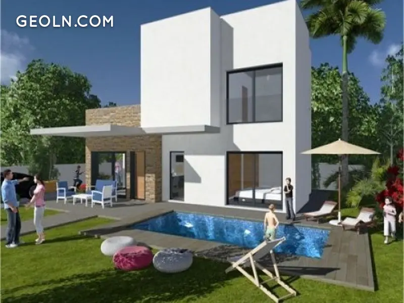 يوجد غرفة معيشة كبيرة ، 2 غرف نوم ، 2 حمام ، مسبح كبير بمساحة 130 متر.