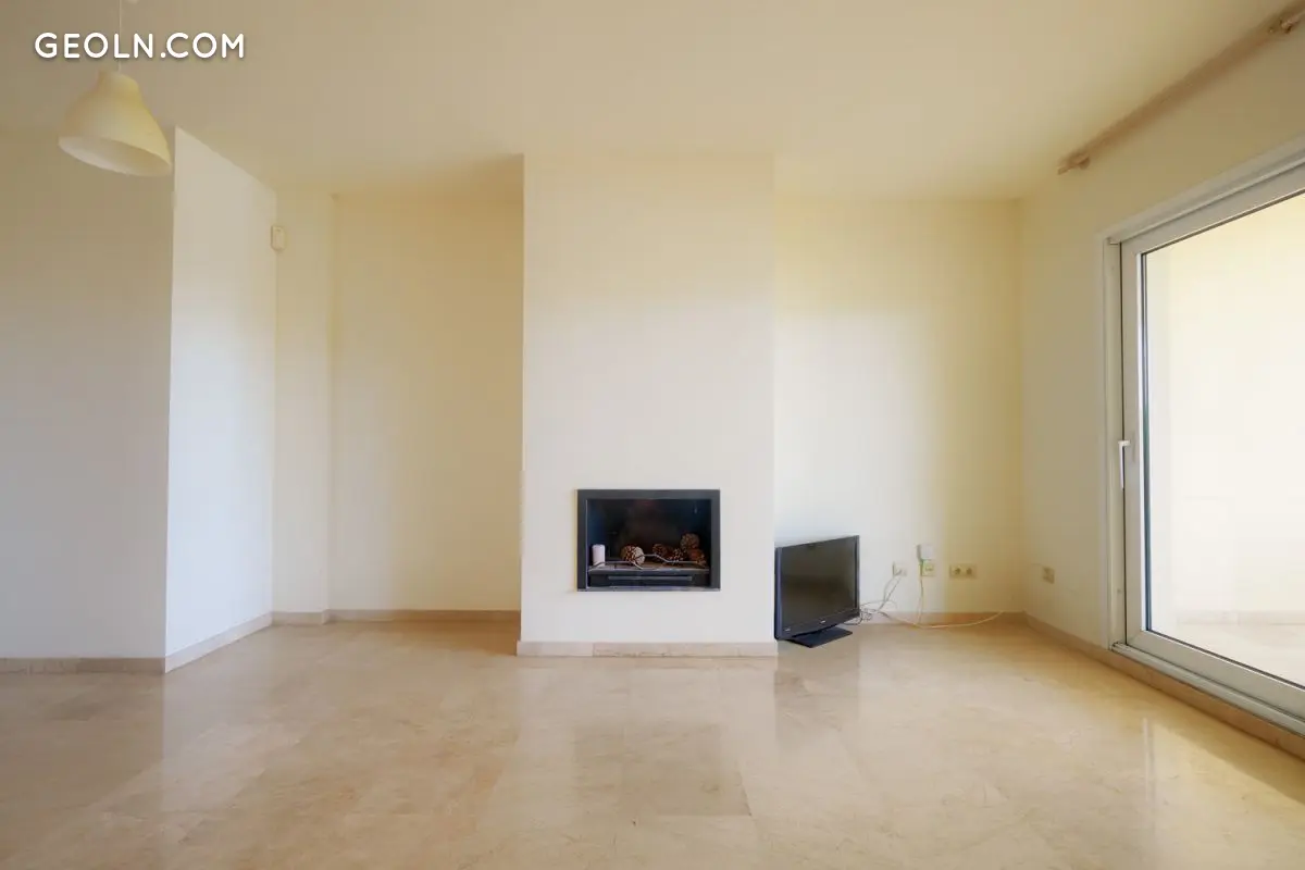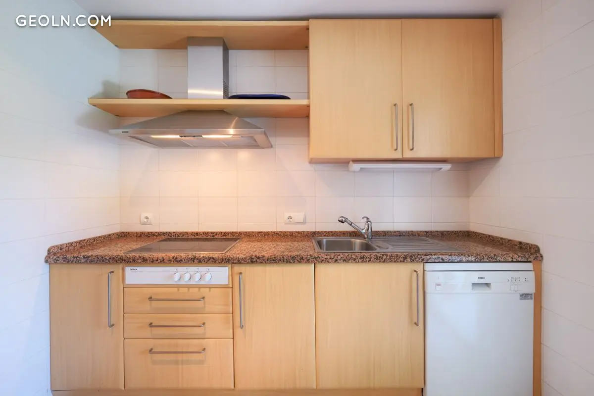 غرفة للمعيشة وتناول الطعام ومطبخ مجهز بالكامل بأجهزة Bosch وغرفة نوم رئيسية وغرفة نوم للضيوف وحمام. الوصول المباشر إلى الشرفة المكسوة بالستائر الزجاجية.