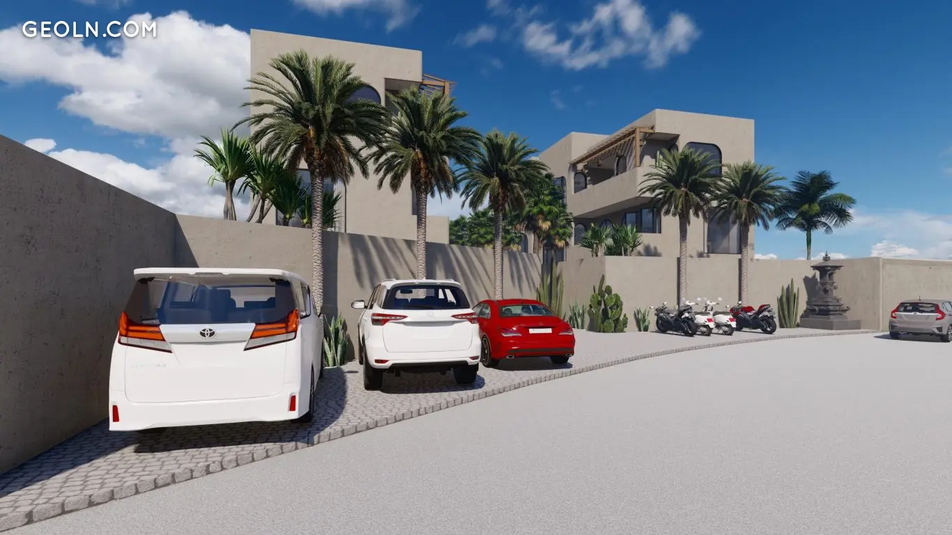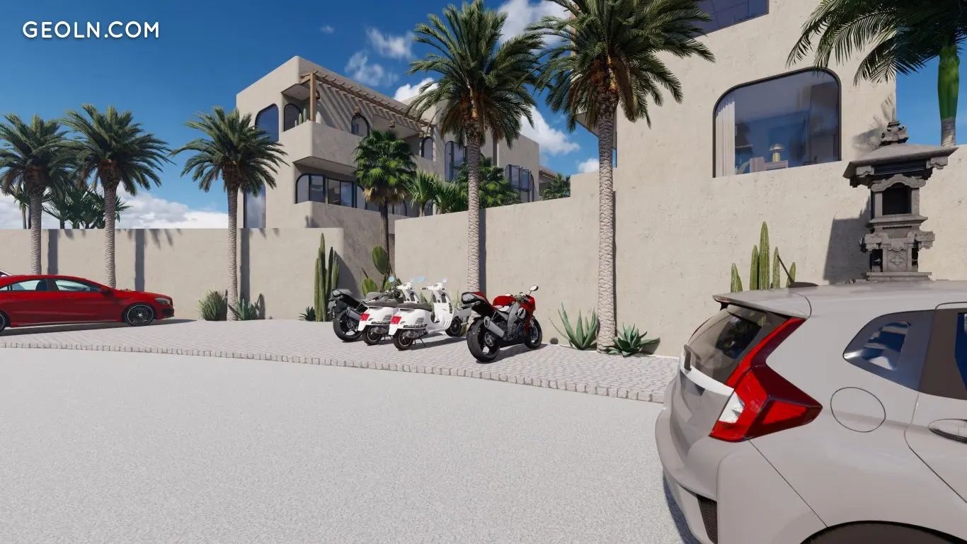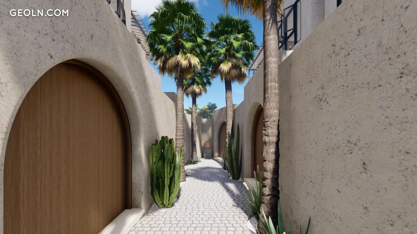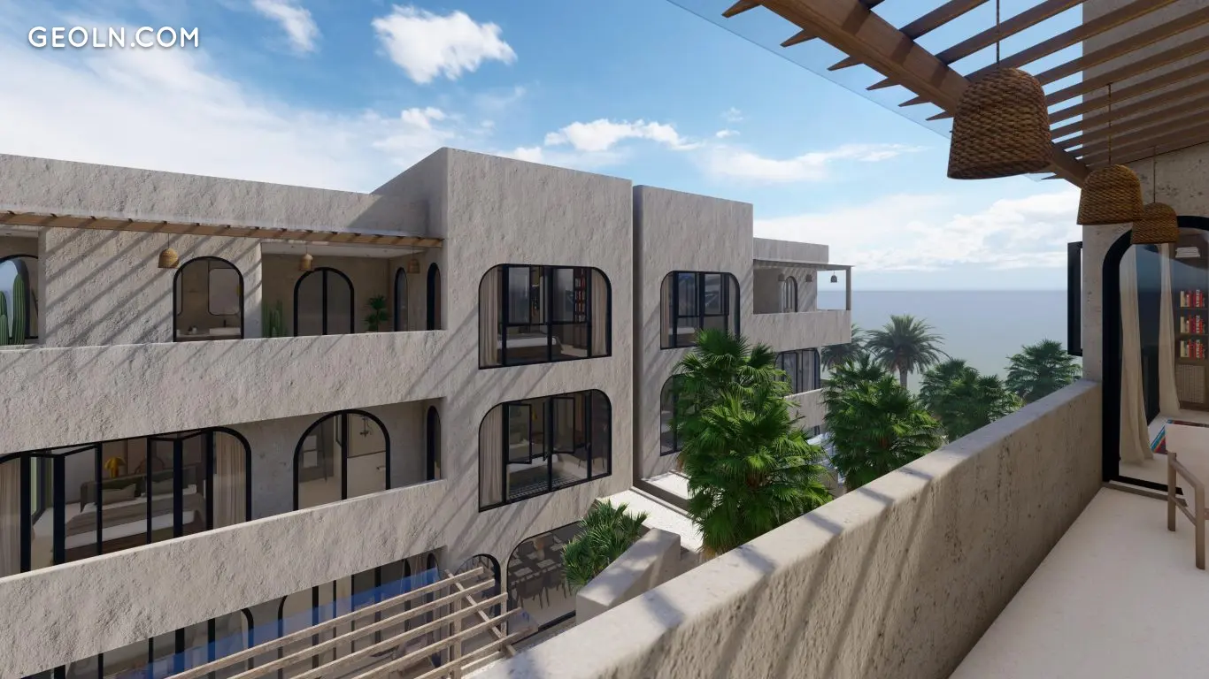 The hotel comes fully furnished and decorated following muted brown color tones which evoke the boho lifestyle. All ensuite bathrooms feature double sinks with a bathtub in the master bedroom. Every villa has a full kitchen and bar, dining room, and living room.