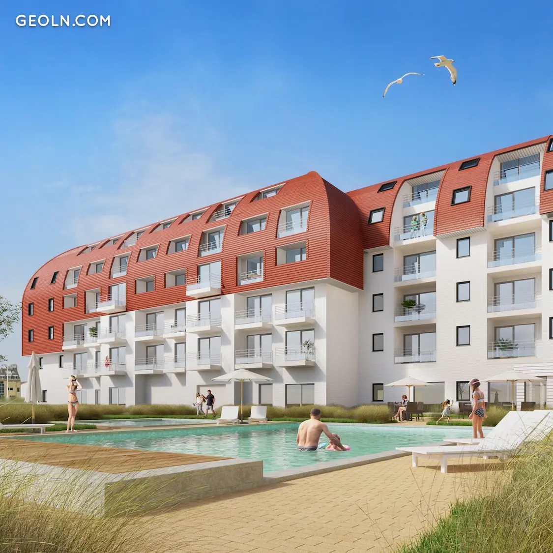The modern Business Suites in Zeebrugge are the perfect environment for any business trip or as a holiday residence. Business and relaxation merge here with meeting rooms, wellness facilities and a fitness center within easy reach. Thanks to the south-facing terraces of the business suites, you can enjoy a view of the inner garden with heated outdoor pool on one side and the impressive world port of Zeebrugge on the other.