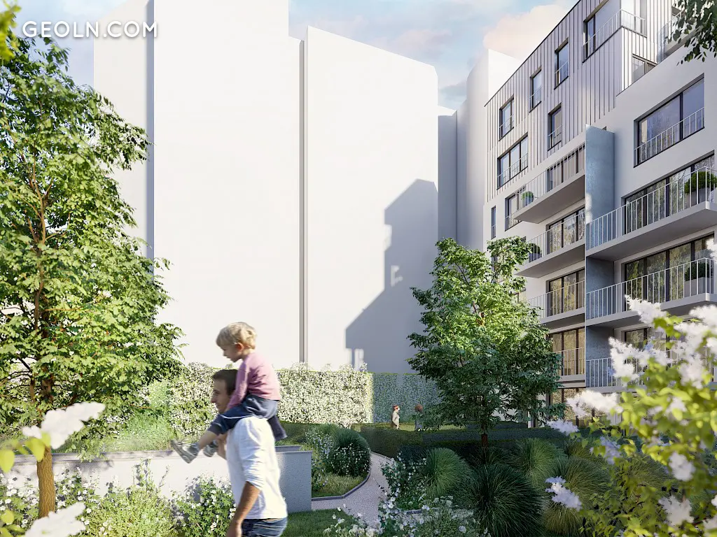 Thanks to its architecture, this building is reminiscent of the beautiful Brussels residences. This vision is reflected in an elegant unit respectful of the environment and in perfect harmony with the existing buildings. Based on a common basement made up of 23 covered car parks and private cellars, this unique urban development, ingeniously arranged and focused on living comfort, offers 21 apartments. The whole is structured around private gardens, a large shared green space generously planted with trees, designed to encourage encounters and conducive to relaxation.