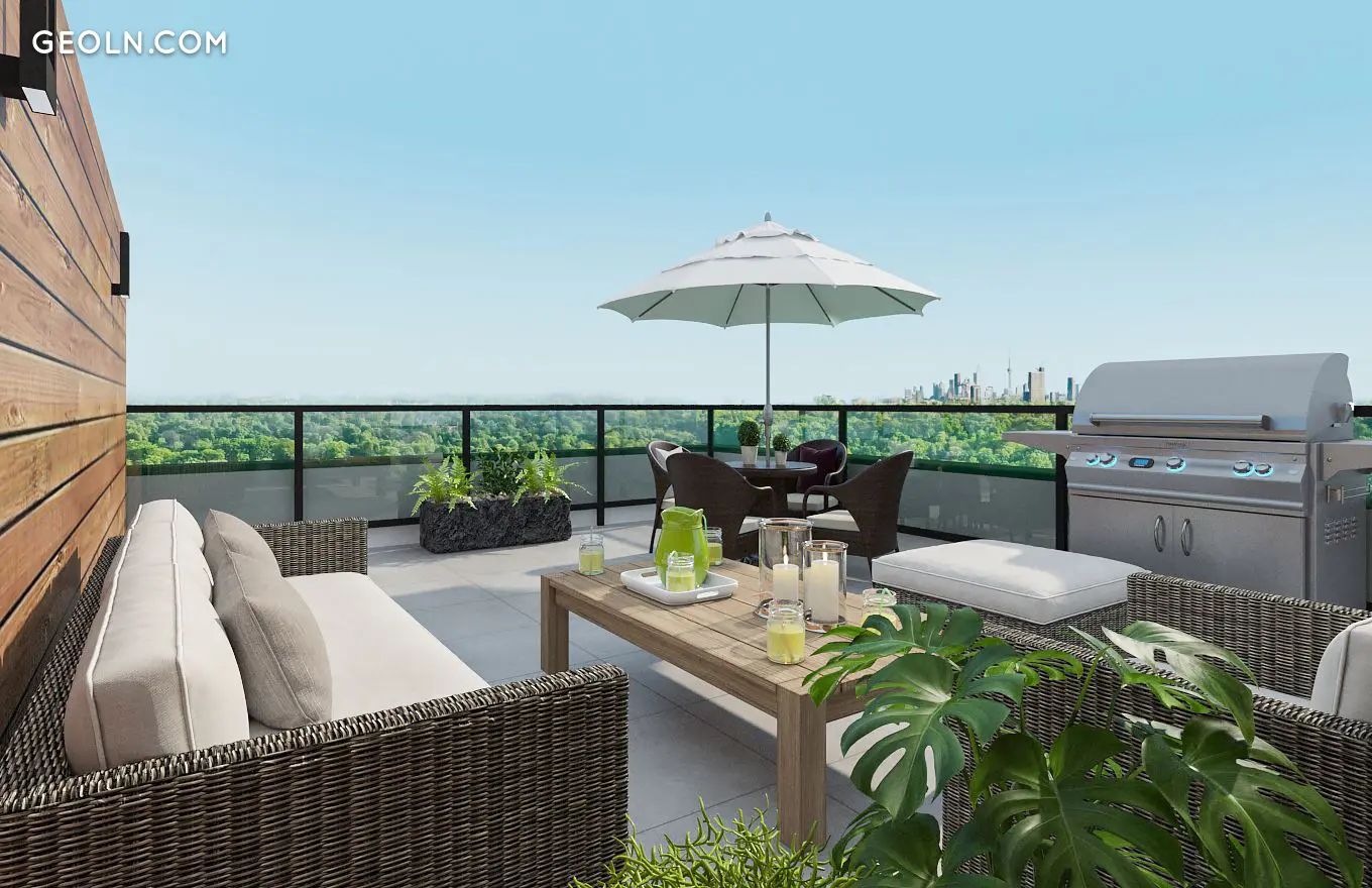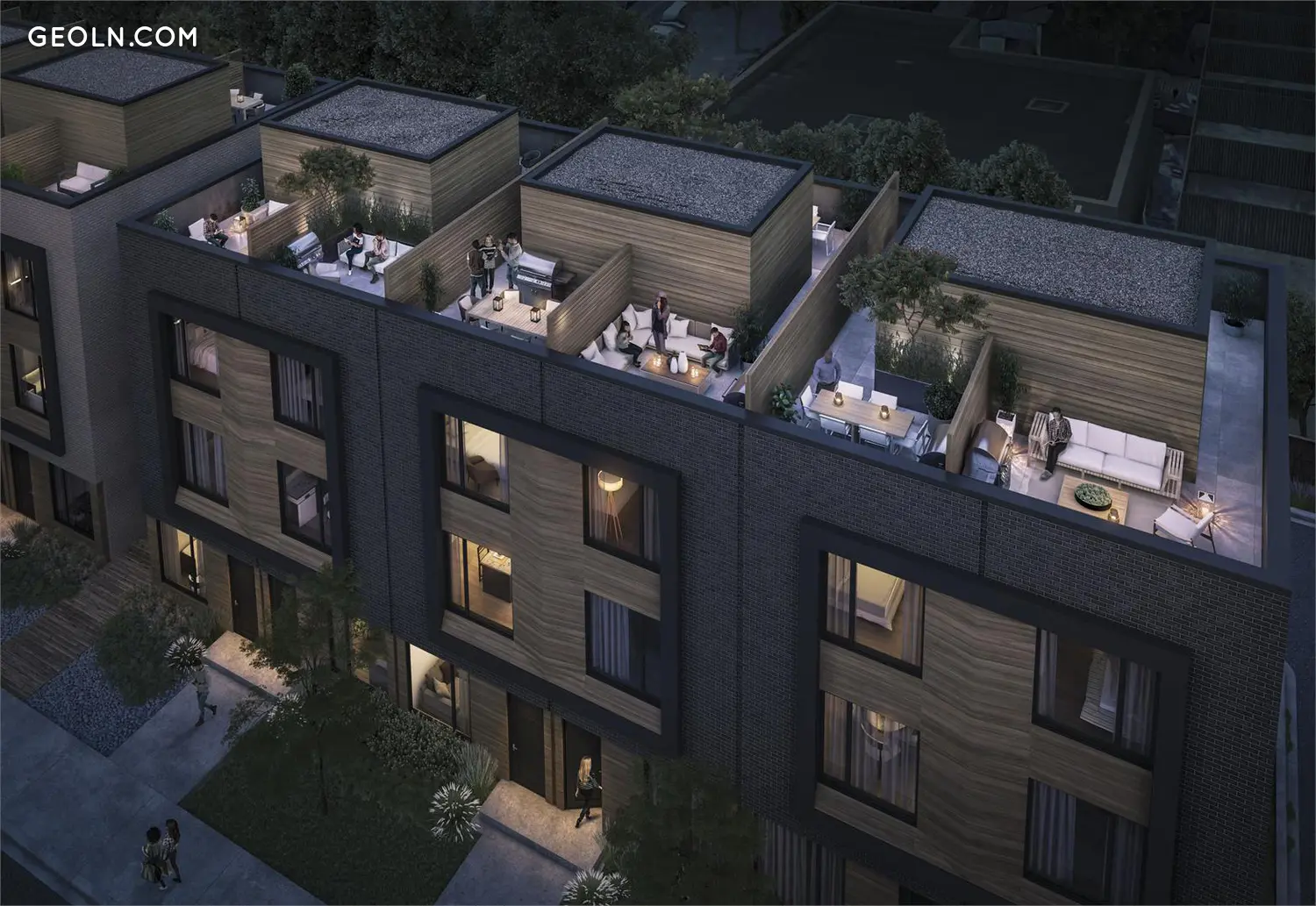 The exterior brick is complemented with wood textured material concrete panels, to create a warm modern interpretation of traditional town homes. Some of the features include, up to 9ft smooth ceilings, engineered hardwood floors and quartz countertops. But best of all, rooftop terraces are part of your outdoor space, designed with a gas bib connection, horizontal wood slat dividers and beautiful city and green views. This is Terraces at Eglinton.
