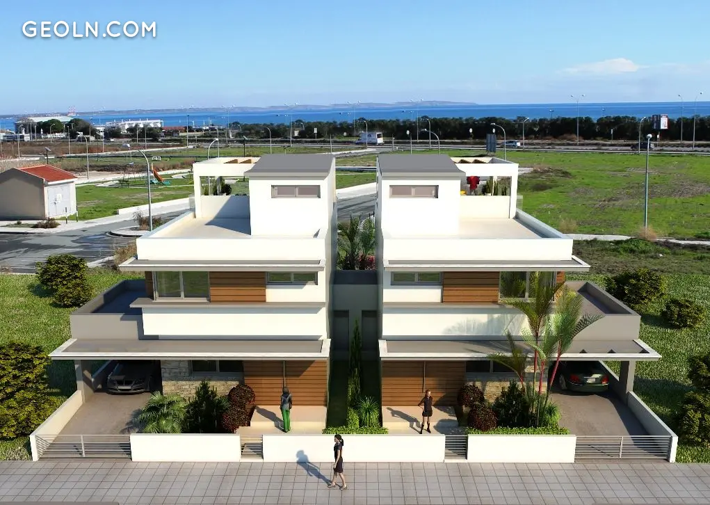 The houses consist of open plan kitchen and living area and guest wc on the ground floor. The first floor hosts the 3 bedrooms (master with ensuite) and main bathroom. The roof garden is ideal for the warm summer nights and the outdoor lifestyle of Cyprus, with views of the sea and the surrounding area. Externally there is covered parking and garden that could accommodate a swimming pool (optional).