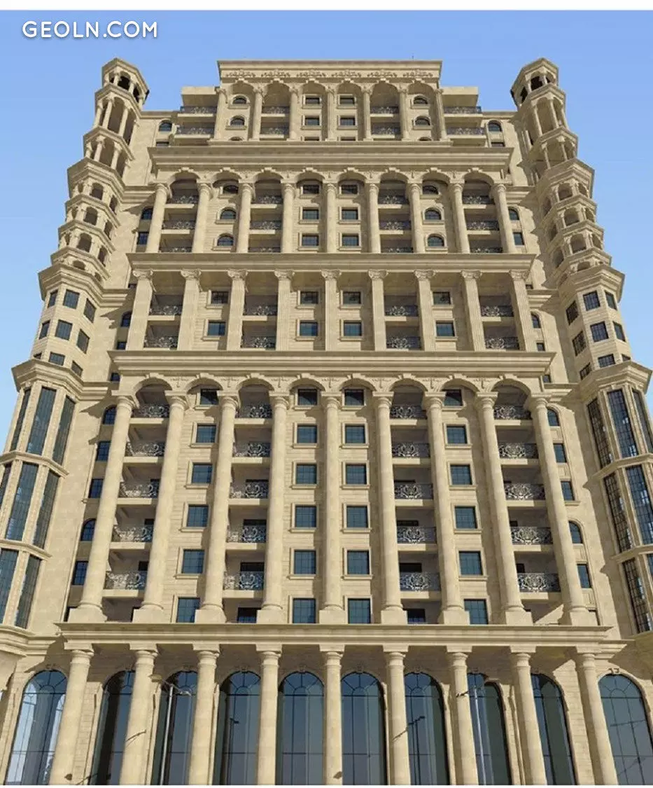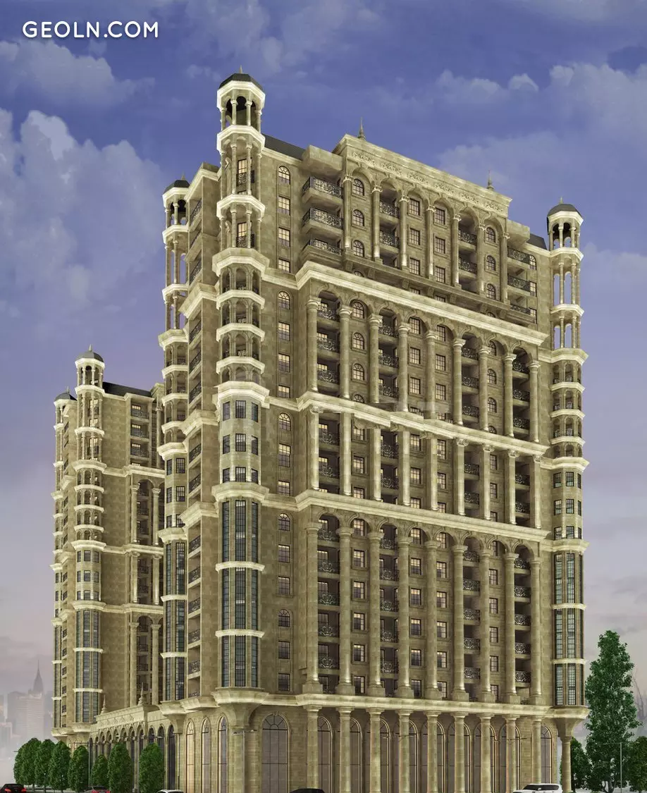 Das neue Gebäude hat ein einzigartiges Aussehen, das es im Stil eines alten Schlosses gestaltet. Ein zweiteiliges Haus an den Ecken der Blöcke ist mit runden Balkontürmen geschmückt. Die Fassade ist mit hohen Säulen und Bogenfenstern geschmückt.