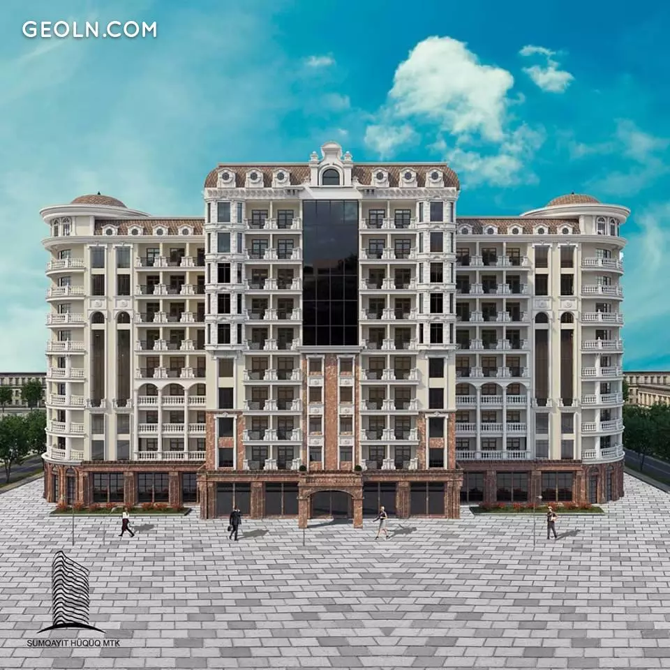 Der Sumqayit Huquq Residential Complex ist ein elf- und zwölfstöckiges Gebäude mit drei Abschnitten, das im klassischen Stil mit Elementen orientalischen Designs gestaltet ist. Das Haus wird nach Technologien gebaut, die eine hohe Erdbebensicherheit und moderate Kosten für die Instandhaltung der Wohnungen gewährleisten. Das Gebäude hat einen monolithischen Stahlbetonrahmen und Backsteinmauern.