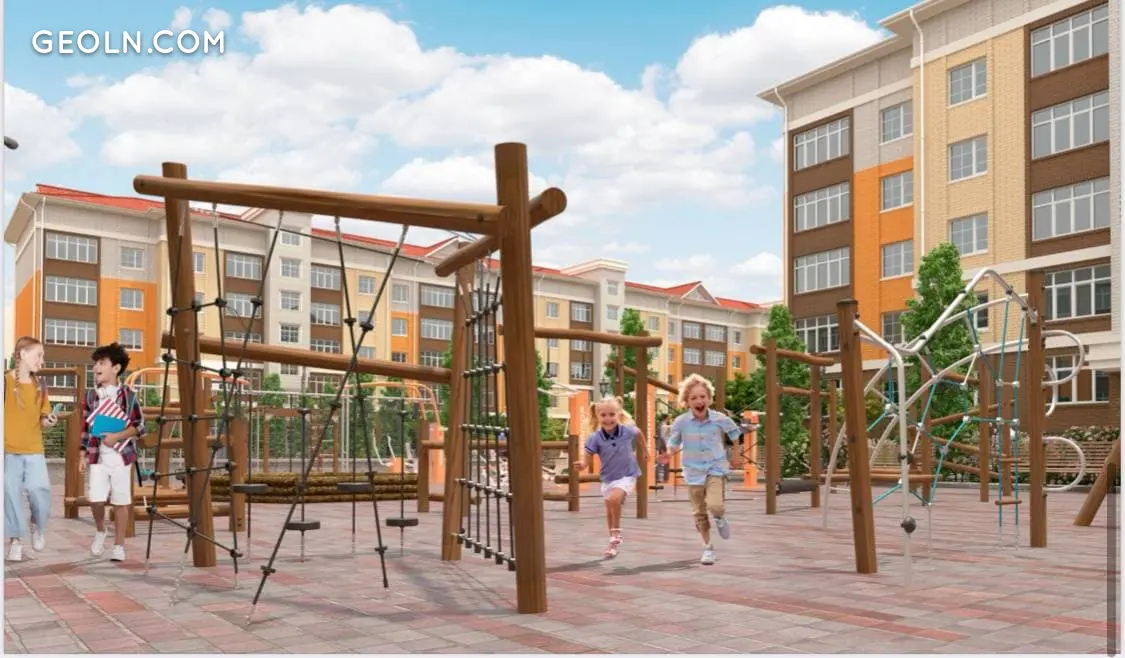 In den Höfen entstehen komfortable Erholungsbereiche mit Pavillons und kleinen architektonischen Formen, Spielplätze mit Schaukeln und Rutschen und Sportplätze mit Outdoor-Trainingsgeräten werden gebaut. Es gibt sogar Plätze für Basketball und andere Sportspiele, die mit einem Metallgitter eingezäunt sind.