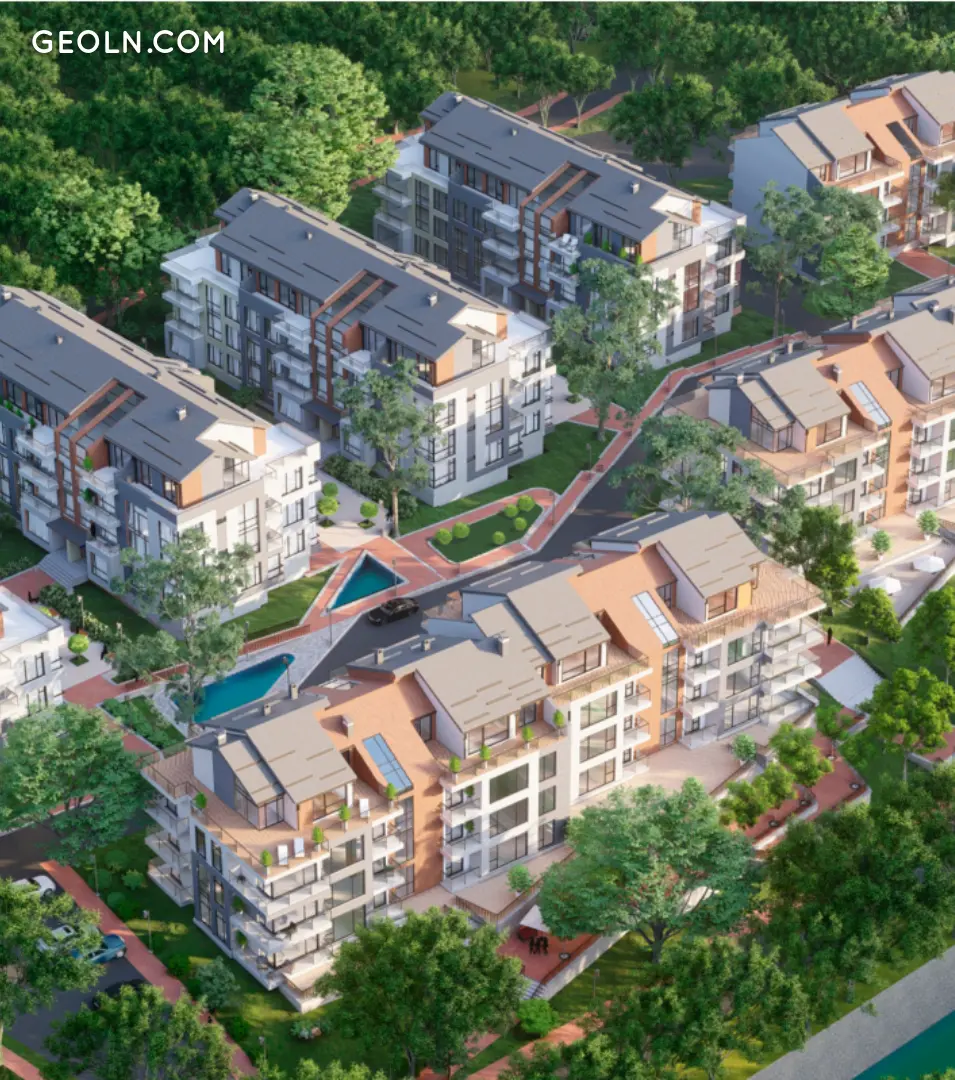 Der Komplex umfasst zehn dreistöckige Häuser der Eliteklasse, deren Bau mit fortschrittlichen Technologien aus umweltfreundlichen Materialien erfolgt. Eine hohe Energieeffizienz des Wohnraums wird durch die Dämmung der Fassade mit einem dauerhaften Wärmeisolator erreicht.