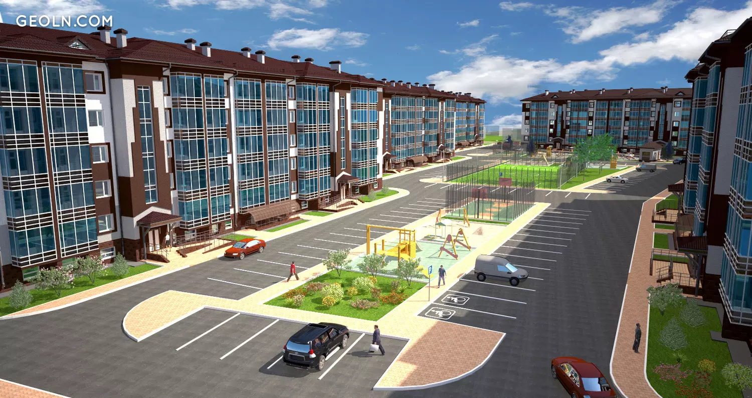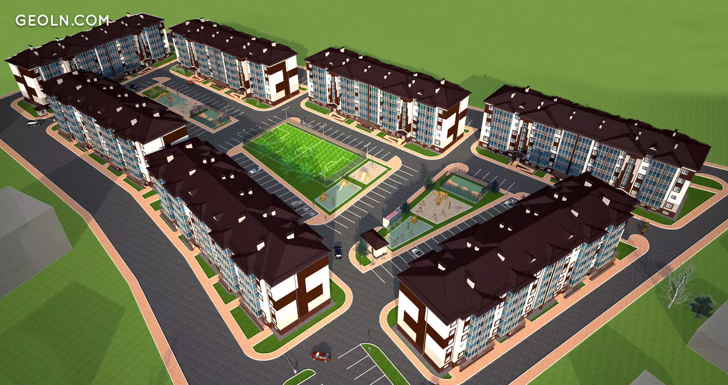 Das neue Gebäude besteht aus sieben fünfstöckigen Gebäuden, die in zwei Schritten gebaut werden. Der Entwickler verwendet umweltfreundliche Materialien - das gesamte Gebäude besteht aus Ziegeln. Die Häuser haben ein geneigtes Dach, die Fassaden sind mit einem dauerhaften Wärmeisolator isoliert, der gute Energieeffizienzindikatoren liefert.