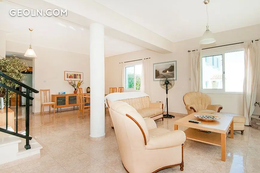 Ihre Villa bietet 165 m².Wohnbereich. Geräumiges Wohnzimmer mit vielen Fenstern, Säulen, sanften Elfenbeinwänden, funkelnden Bodenfliesen und einer eleganten Marmortreppe, die in den zweiten Stock zu den Schlafzimmern führt.Das Wohnzimmer öffnet sich auf eine vordere Terrasse mit Swimmingpool.