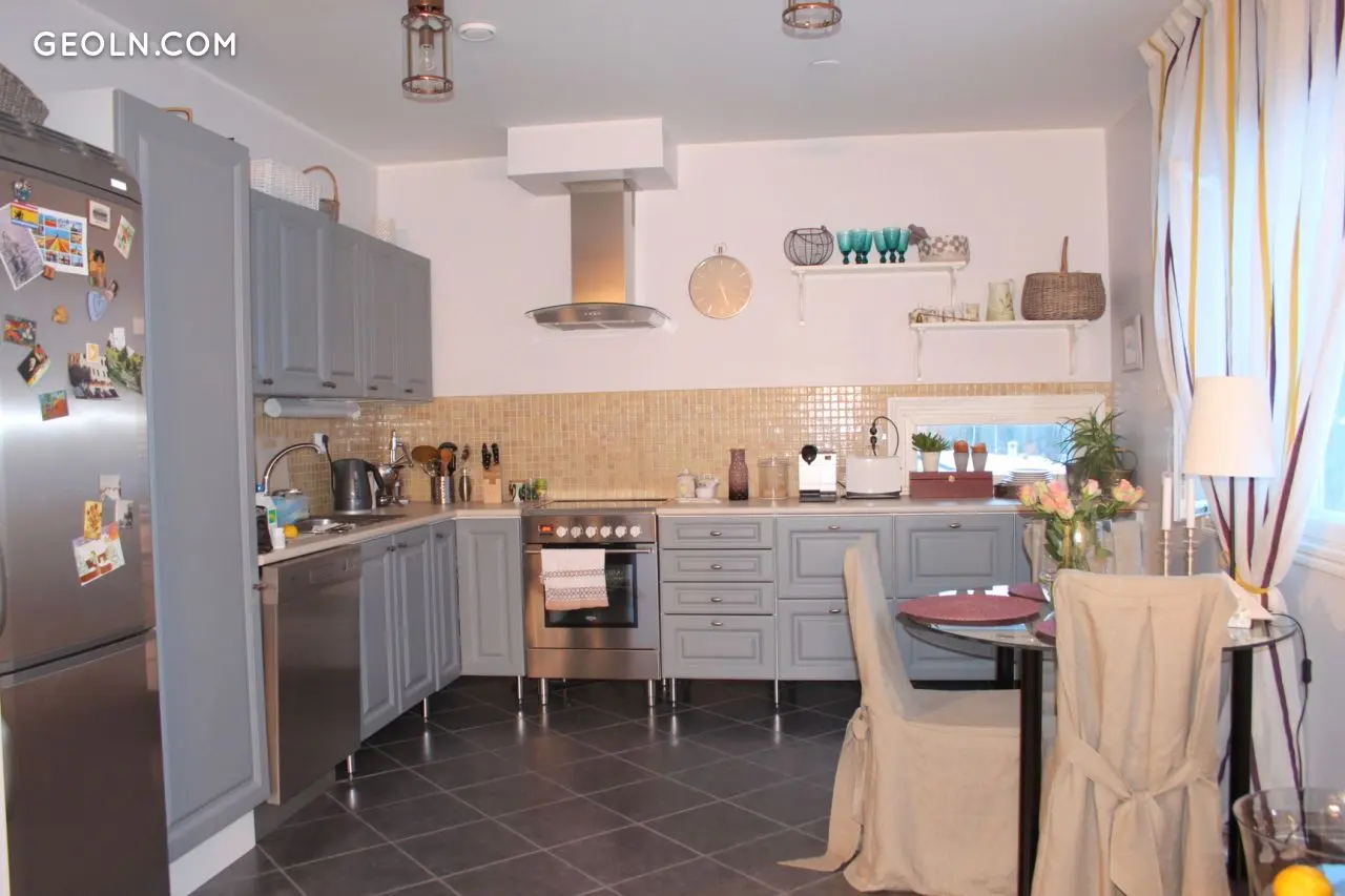 Die Die Küche ist mit Haushaltsgeräten ausgestattet (Kühl-/Gefrierschrank, Cerankochfeld, Dunstabzugshaube, Geschirrspüler).