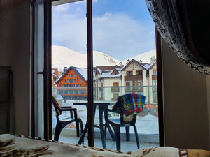 Es wird eine renovierte, möblierte Wohnung in Neu Gudauri verkauft, 5. Etage des Aparthotels, Blick auf den Berg und das im Bau befindliche Hotel. Zoning: Schlafbereich, Essbereich, Kinderbereich zum Schlafen. Skiraum. 24-Stunden-Rezeption.