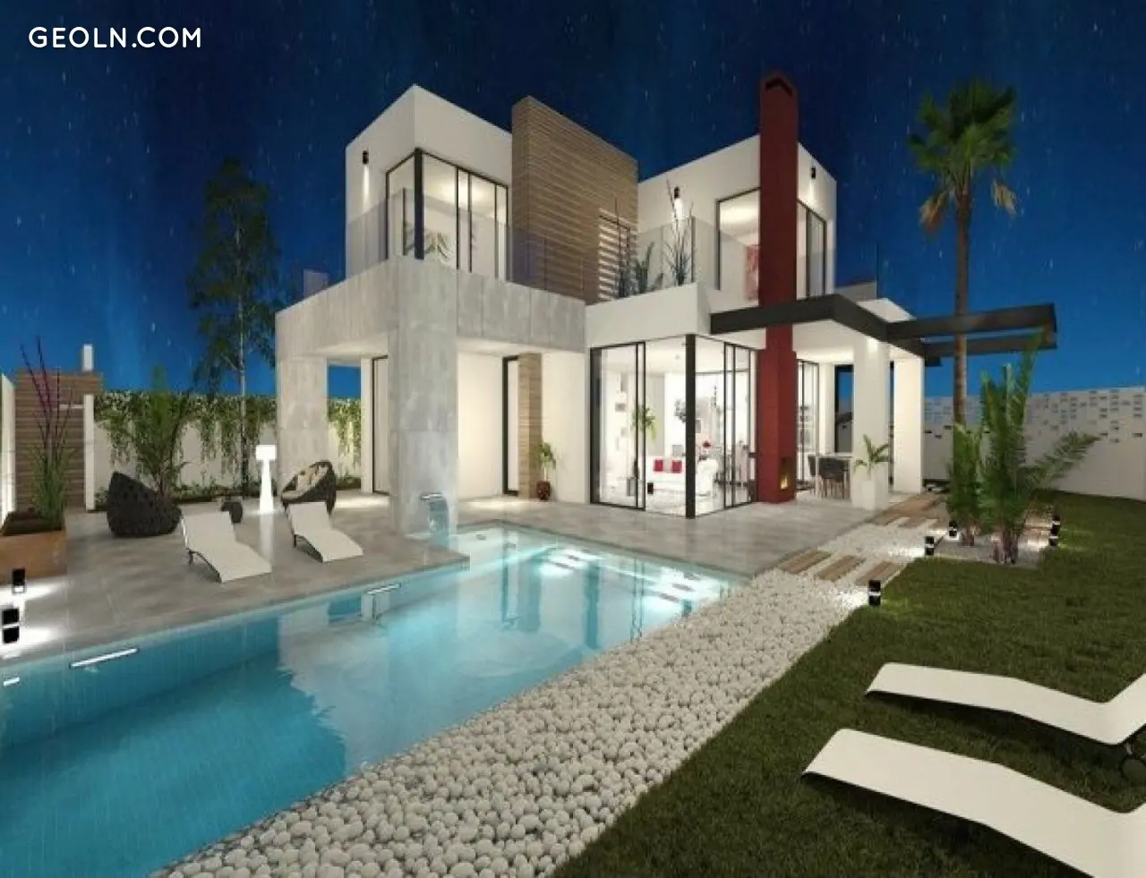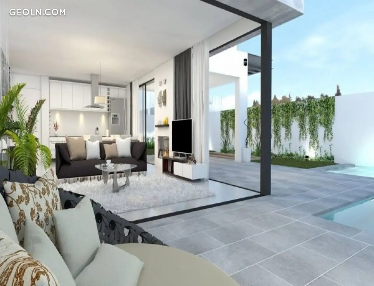 Auf einem Grundstück von 462 m2 gibt es einen Garten, einen privaten Pool und einen Parkplatz. Die Villa ist mit hochwertigen Materialien gebaut.