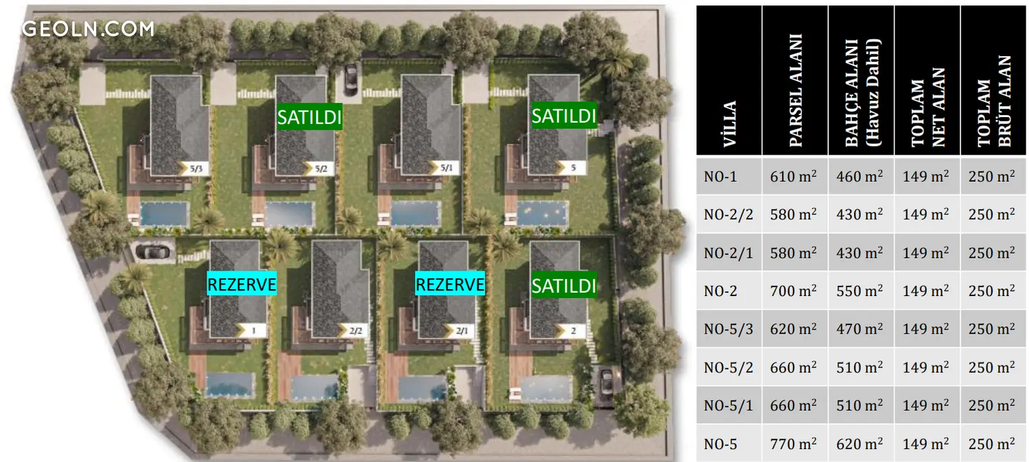 Das Ceshme Dalyan Projekt befindet sich in der Dalyan-Region von Cesme. Die 8 im Projekt entworfenen Villen befinden sich auf einem Grundstück mit weitem Panorama und Blick auf die Landschaft. Die Wohnräume, Dächer und Pools jeder Villa wurden unter Berücksichtigung der Privatsphäre innerhalb des Geländes so gestaltet, dass sie sich visuell nicht gegenseitig blockieren. Private Gärten für jede Villa wurden durch Landschaftsbauarbeiten angelegt.