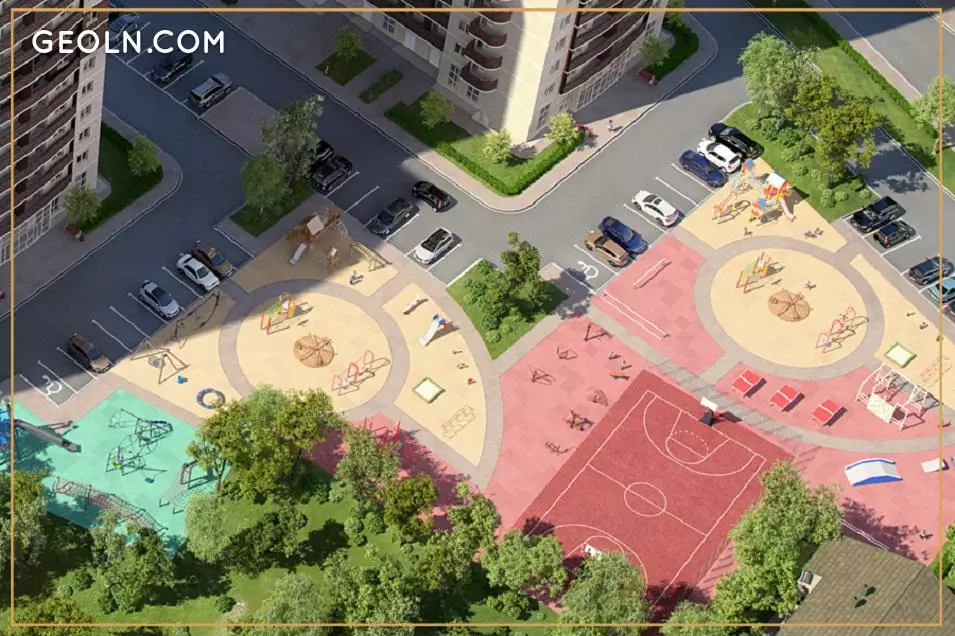 Das Gebiet des Komplexes ist eingezäunt und überwacht. Es wird einen Gästeparkplatz für Autos geben. Es gibt Erholungsgebiete für Kinder, Erwachsene und Sportfans.
