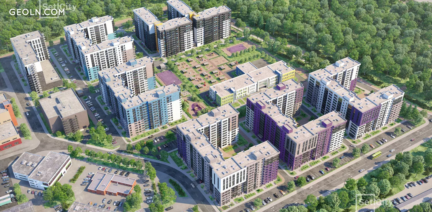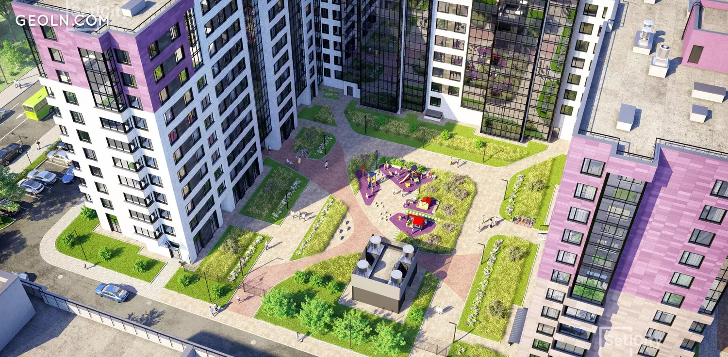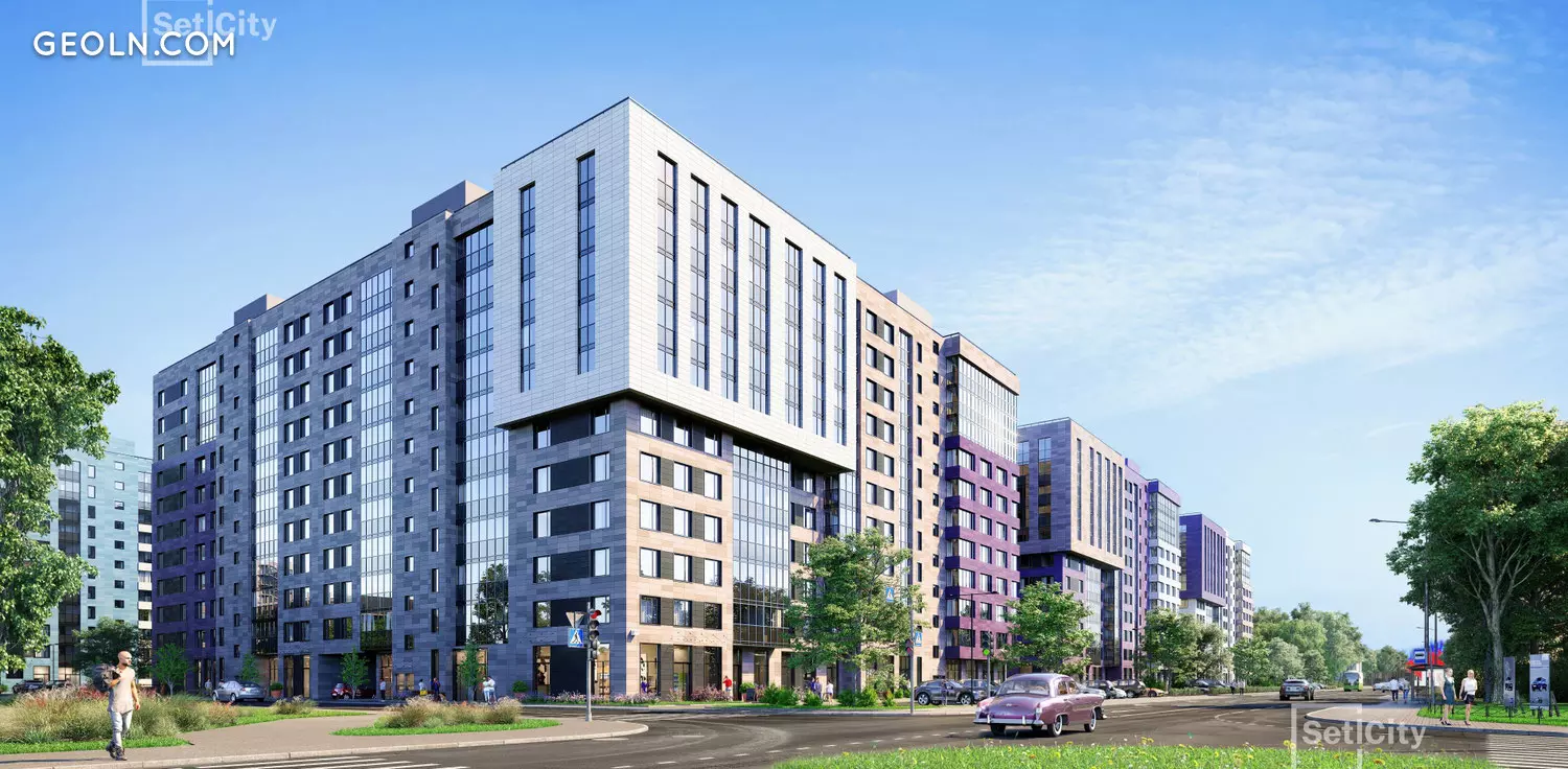 Fünf Häuser mit 11 Etagen und zwei Apartmentkomplexe mit 12 Etagen werden durch ein modernes Konzept vereint. Die Fassaden haben eine für St. Petersburg seltene violette Farbe. Dies ist eine der edelsten, raffiniertesten und gleichzeitig mysteriösesten Farben. Die Hauptlichtpalette setzt positive Akzente. Vorhangbelüftete Fassaden ermöglichten es den Architekten, mit der Wahrnehmung zu spielen. Durch die Kombination verschiedener Porzellansteinfarben in der Verkleidung entsteht ein Melange-Effekt. Volumetrische architektonische Elemente in Form von großen Bildschirmen, reflektierenden Verglasungen und Panoramafenstern in den obersten Etagen sorgen für ein futuristisches Erscheinungsbild. Das Design der Projekthallen wurde beim Art-Complex-Wettbewerb entwickelt. Künstler aus verschiedenen Städten Russlands präsentierten mehr als 50 Werke und ihre Ansichten zu ihrer geliebten Stadt.