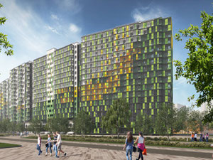 Das Viertel wird mit einer monolithischen Technologie gebaut, die belüftete Fassaden verwendet, die die Haltbarkeit des Gebäudes, die hohe Wärme- und Schalldämmung der Räumlichkeiten gewährleisten.
