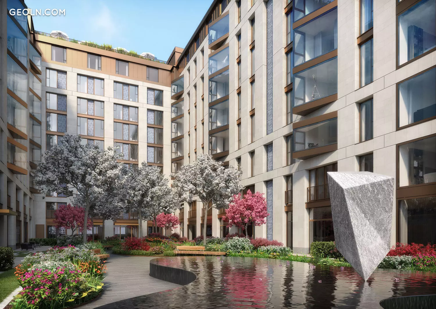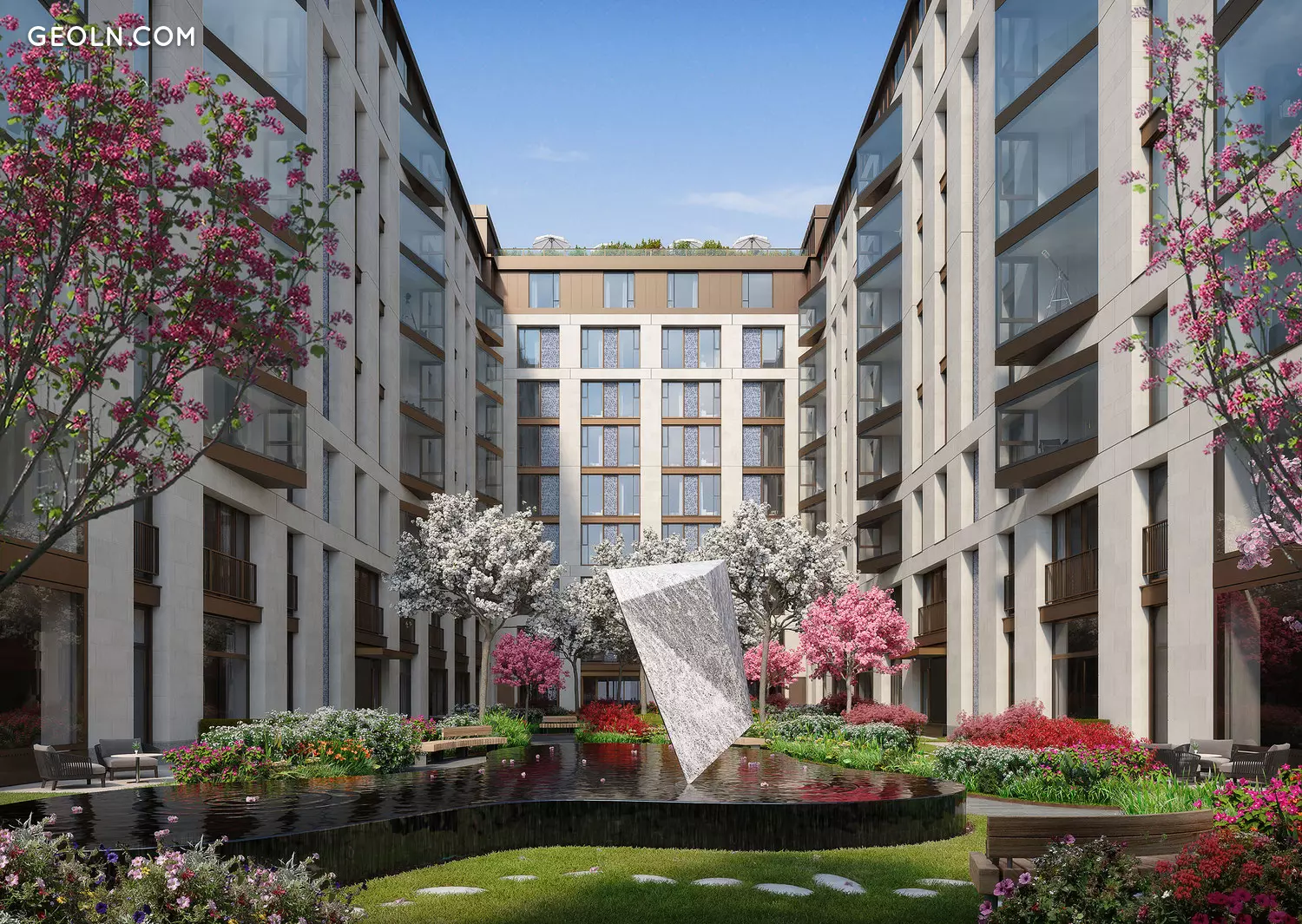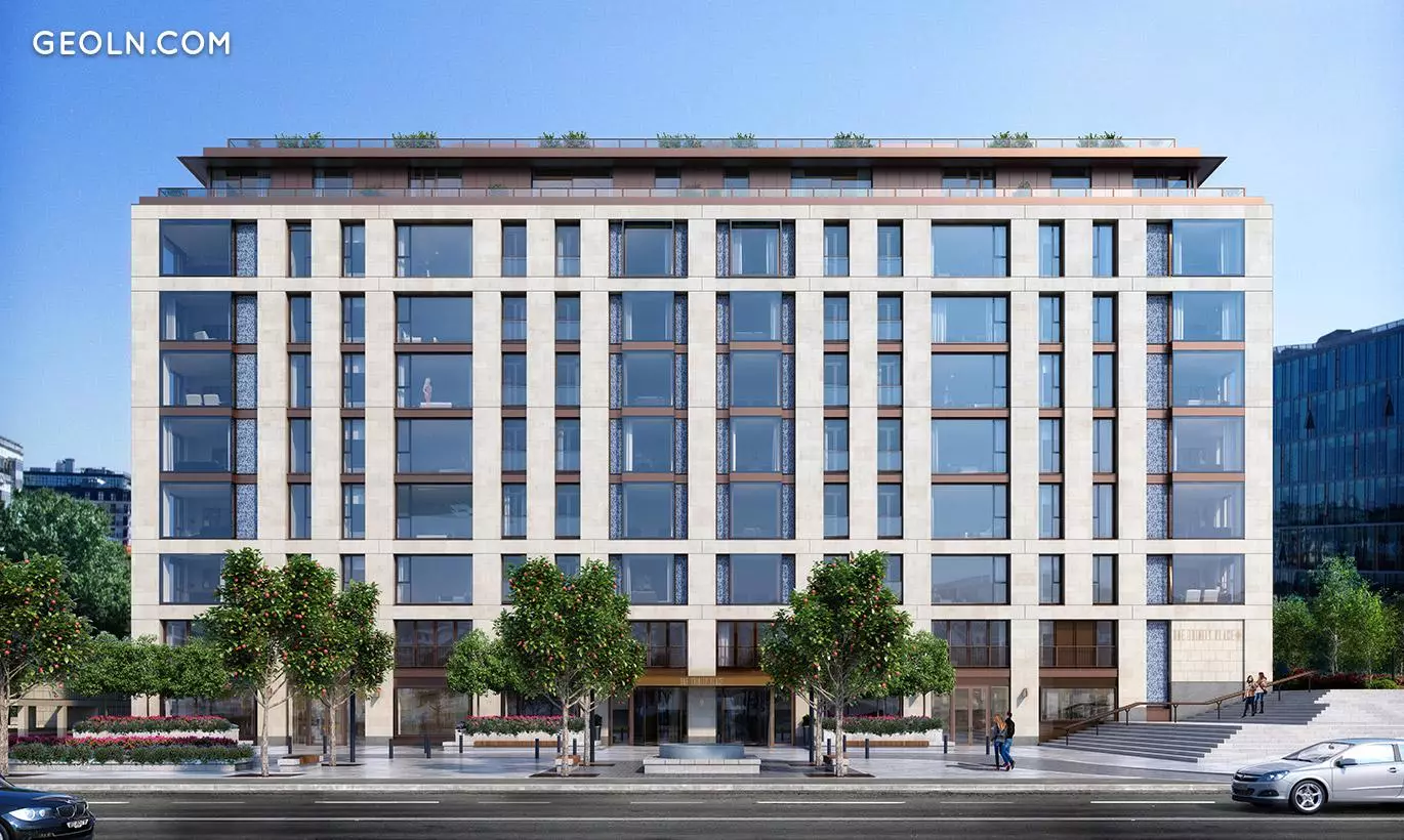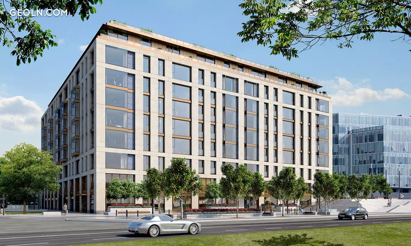Die Fassade des Gebäudes ist mit natürlichem Granit und Kalkstein verkleidet und zusätzlich mit Einsätzen aus blau-blauem Mosaik verziert. Dank eines solch exquisiten Designs wird das Gebäude von weitem erkennbar und fügt sich optisch perfekt in die umgebende Stadtentwicklung ein.