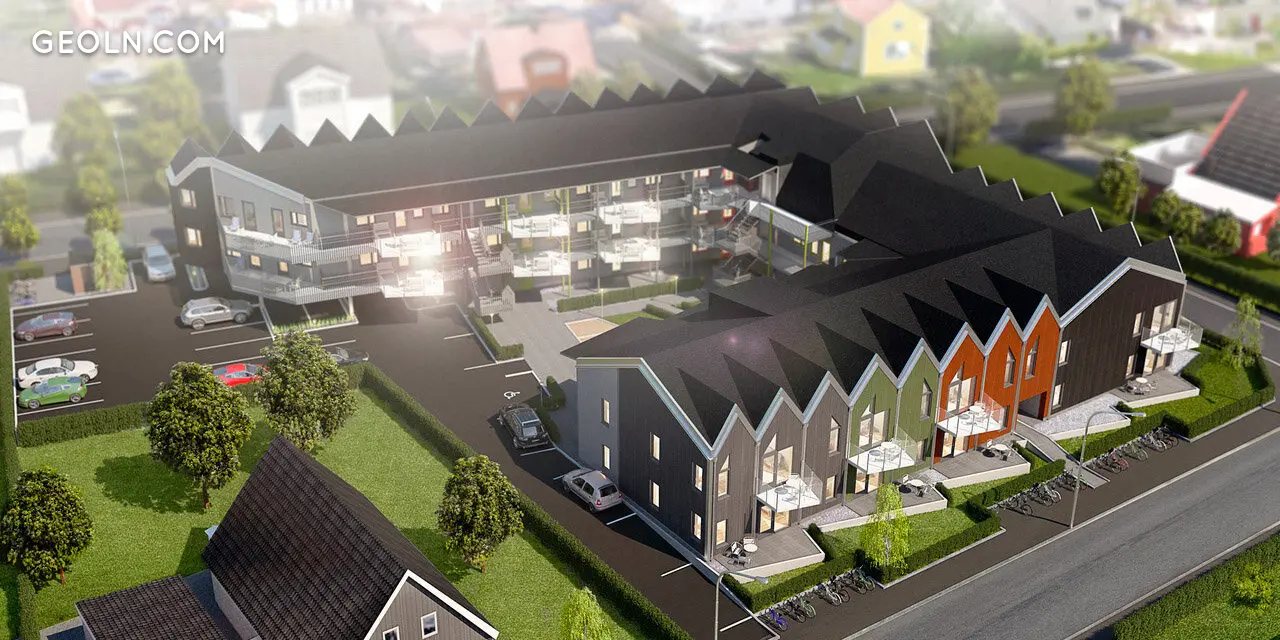 PEAB осуществляет строительство под ключ. Проект разработан AG Arkitekter в современном морском стиле с хорошей поверхностью и энергоэффективностью. В домах элегантные кухни из ведума и теплые полы по всей квартире. В квартирах наверху дома можно установить дровяную печь. Квартиры строятся в традиционном жилом районе, где сейчас добавляется дополнительная форма жилья.
