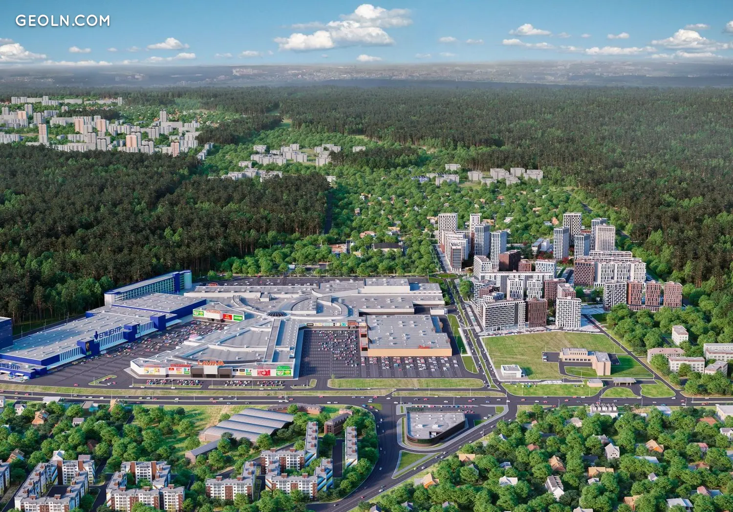 Die Wohnanlage Lucky Land ist ein ganzes Viertel im skandinavischen Stil. Auf der Nordseite ist der Komplex von einem dichten Pinienwald von 100 Hektar umgeben und eine 5-minütige Fahrt vom Erholungsgebiet von Kiew - Pushcha Vodytsya entfernt. Ökologisch sauberer Bereich zum Leben.