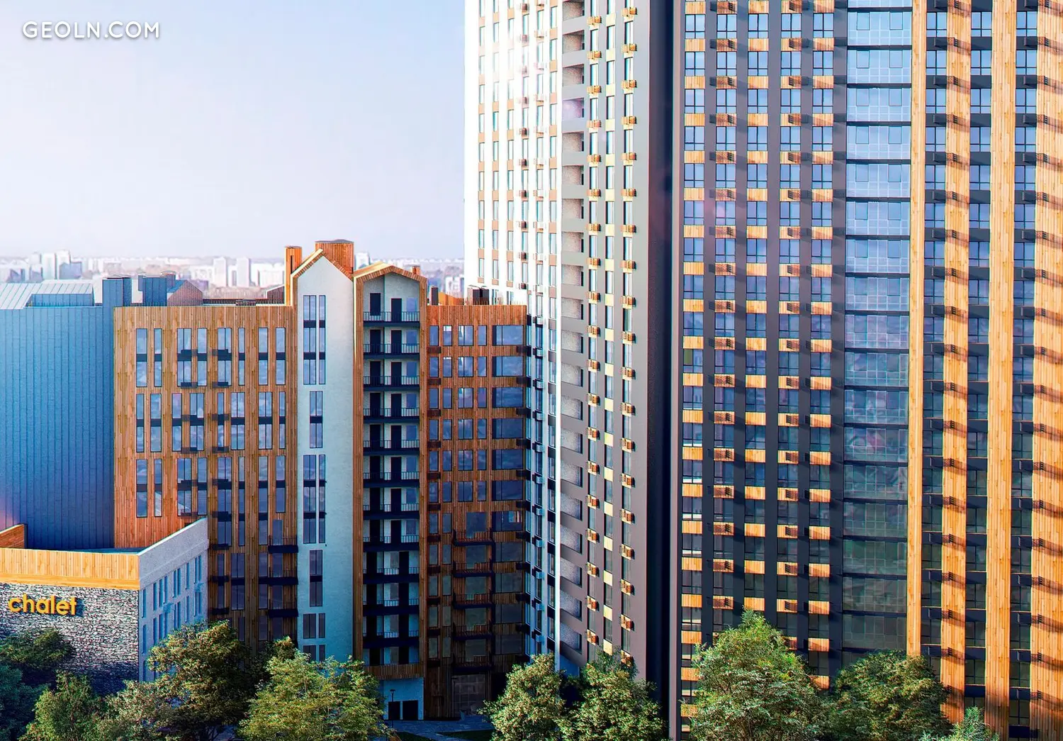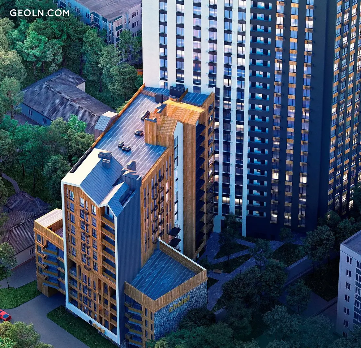 Der Wohnkomplex Chalet ist ein alpines Chalet mit Interieur des berühmten ukrainischen Modedesigners Andre Tan zwischen Eichen und Kiefern des Erholungsgebiets Sviatoshyn. Die Architektur des Neubaus ist so konzipiert, dass das Haus sowohl in die natürliche Umgebung als auch in die Infrastruktur der Metropole harmonisch wirkt: unterschiedliche Geschosse, hohe Fenster für bessere Sonneneinstrahlung, Fassadendekoration und dekorative Elemente aus natürlichen Materialien - Holz, Stein , Glas und Metall.