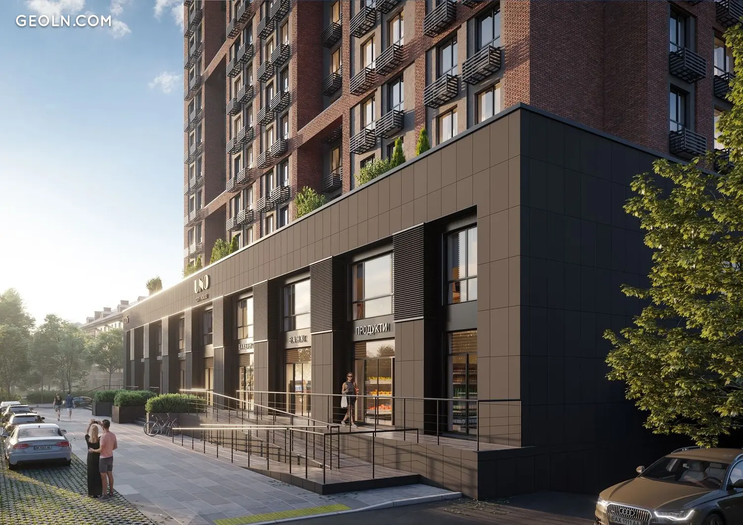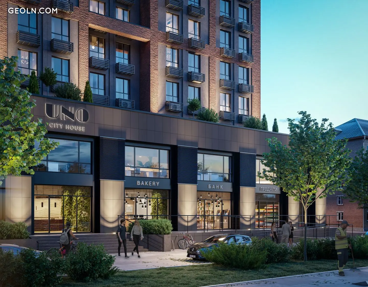 Die interne Infrastruktur des UNO City House Komplexes wird auf den ersten beiden Geschossen mit Gewerbeimmobilien konzentriert – im ersten Obergeschoss werden Shops und im zweiten Obergeschoss Büros eröffnet.