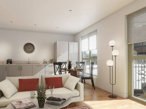 Entlang Copley Close erstreckt sich die neue Wohnanlage im Zentrum des Copley-Erneuerungsprojekts. Die mittelhohe Entwicklung bietet warme Töne und traditionelles Mauerwerk, die eine gemütliche Atmosphäre schaffen. Die dörfliche Atmosphäre wird mit schlichten, modernen Details gemischt. Der Central Square ist großzügig mit riesigen raumhohen Fenstern gespickt, die von geräumigen Balkonen mit Glasbalustraden begleitet werden.