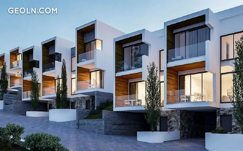 Las líneas arquitectónicas modernas de Arias se trasladan a las casas adosadas con llamativas terrazas en voladizo y escaleras de vidrio de doble altura que son características clave de las fachadas. Con un equilibrio perfecto de materiales, las residencias Aria cuentan con terrazas con estructura de hormigón, piedra natural y iroko. Los grupos están separados por zonas verdes ajardinadas que garantizan una circulación óptima y maximizan la privacidad.