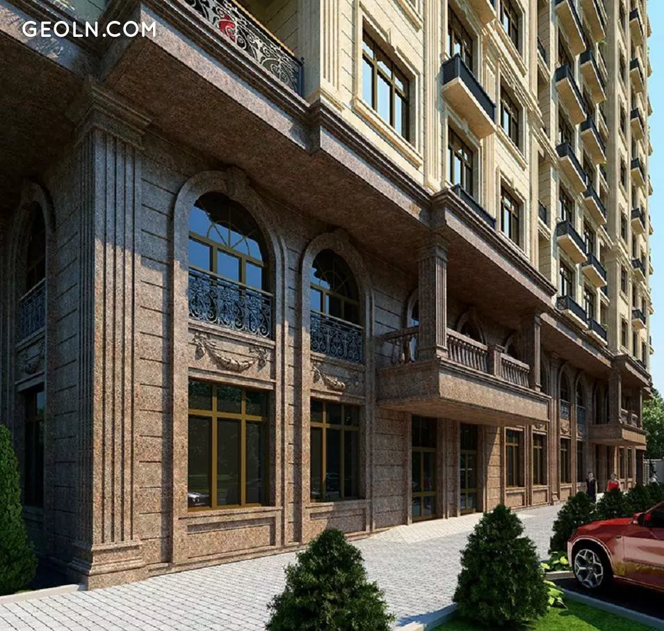 Para implementar el proyecto, el desarrollador eligió el estilo arquitectónico clásico y la tecnología moderna de construcción de ladrillos monolíticos. Las fachadas están decoradas con piedra natural, y los elementos decorativos en la parte superior del edificio sirven como decoración adicional de la estructura.