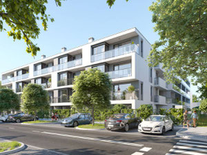 Hay aceras alrededor de los edificios, jardines bien cuidados y zonas de relajación con bancos. Los vecinos tienen a su disposición ascensores silenciosos, trasteros, plazas de aparcamiento sobre rasante y en el aparcamiento subterráneo. La inversión incluye locales de servicio.