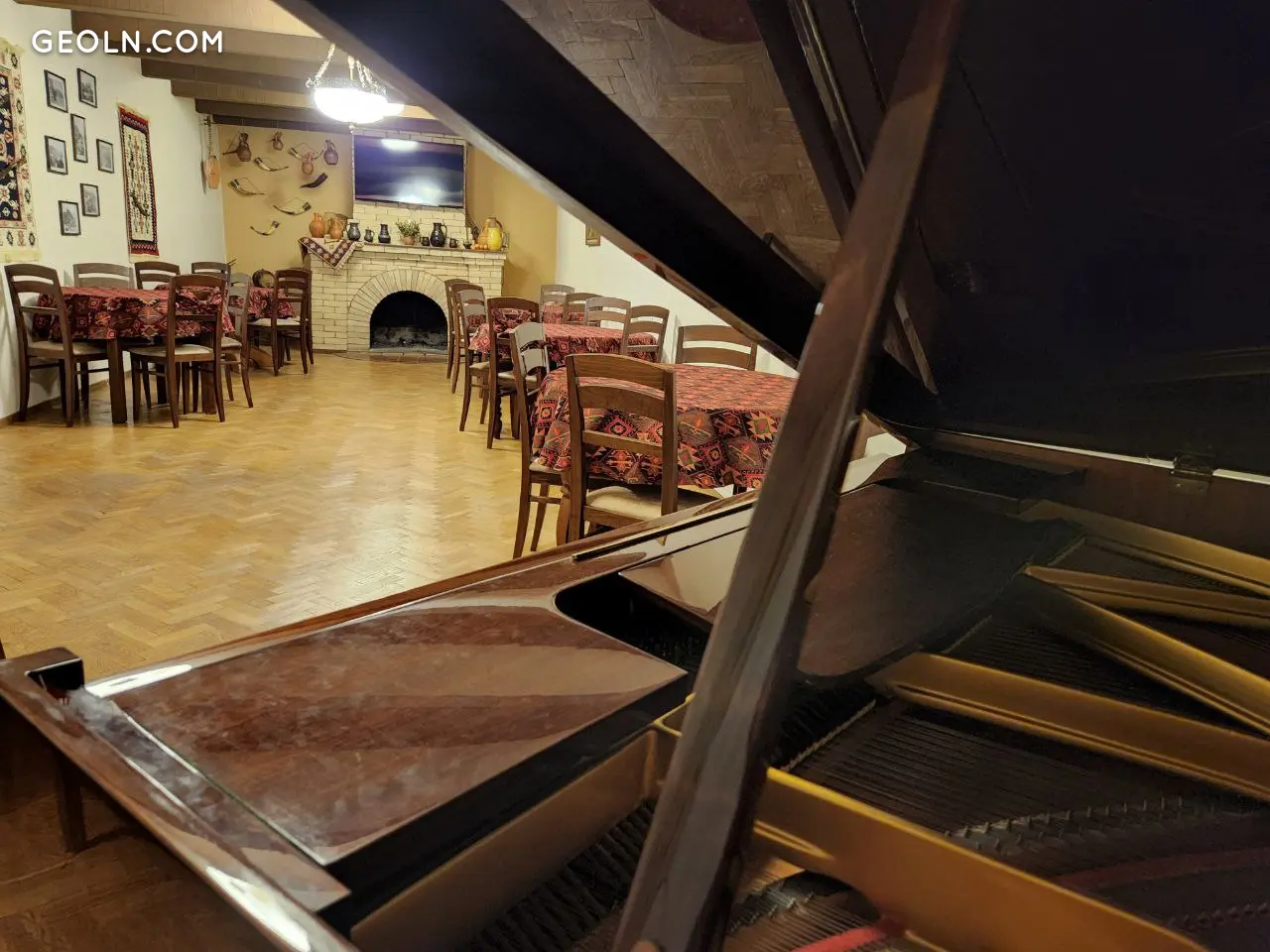 The house has two floors. Restaurant hall on the ground floor: fireplace, piano, 6 tables. On the second floor there is a hotel: 5 rooms.