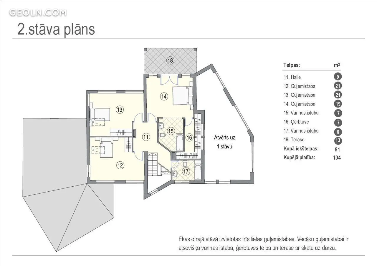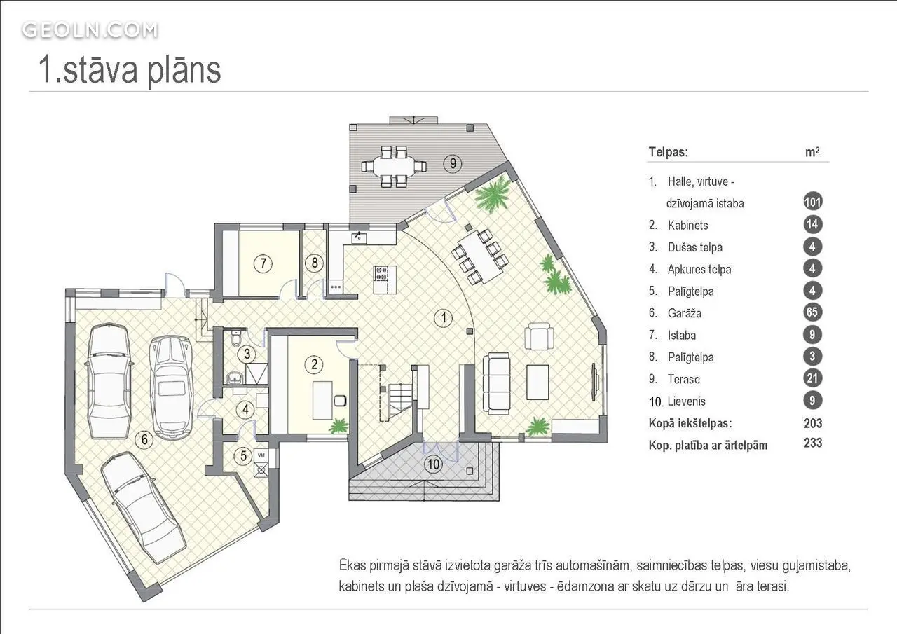- Planta baja: recibidor, cocina - 101m², salón, oficina, dormitorio, ducha, lavadero, cuarto de calefacción, garaje para 3 coches, terraza 21m².