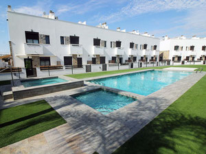 Green Garden II es un conjunto residencial formado por viviendas adosadas con piscina privada, 3 dormitorios y 3 baños, ubicado en Pilar de la Horadada, en el sur de la Costa Blanca. La casa consta de dos plantas más solárium con cocina de verano. En la planta baja hay un amplio salón comedor con cocina americana desde la que se accede al jardín de la casa. Además, dispone de un dormitorio y un baño totalmente equipado. En la primera planta encontramos el dormitorio principal con vestidor y baño, otro dormitorio y baño y acceso al solárium. Además viene preinstalado con aire acondicionado por conductos, cocina equipada con electrodomésticos, aerotermia, iluminación, puerta blindada, ventanas de aluminio, etc. ¡Amplia información con Sunnier Homes!