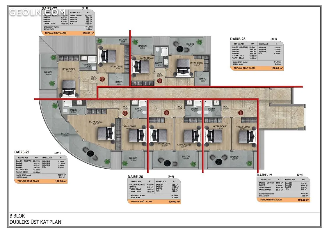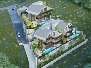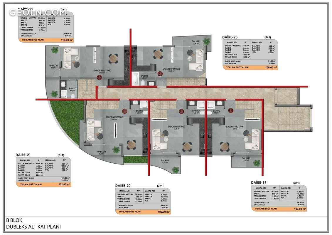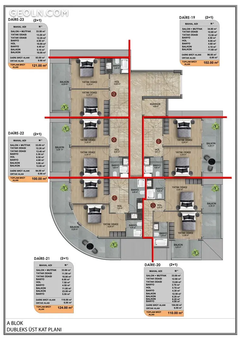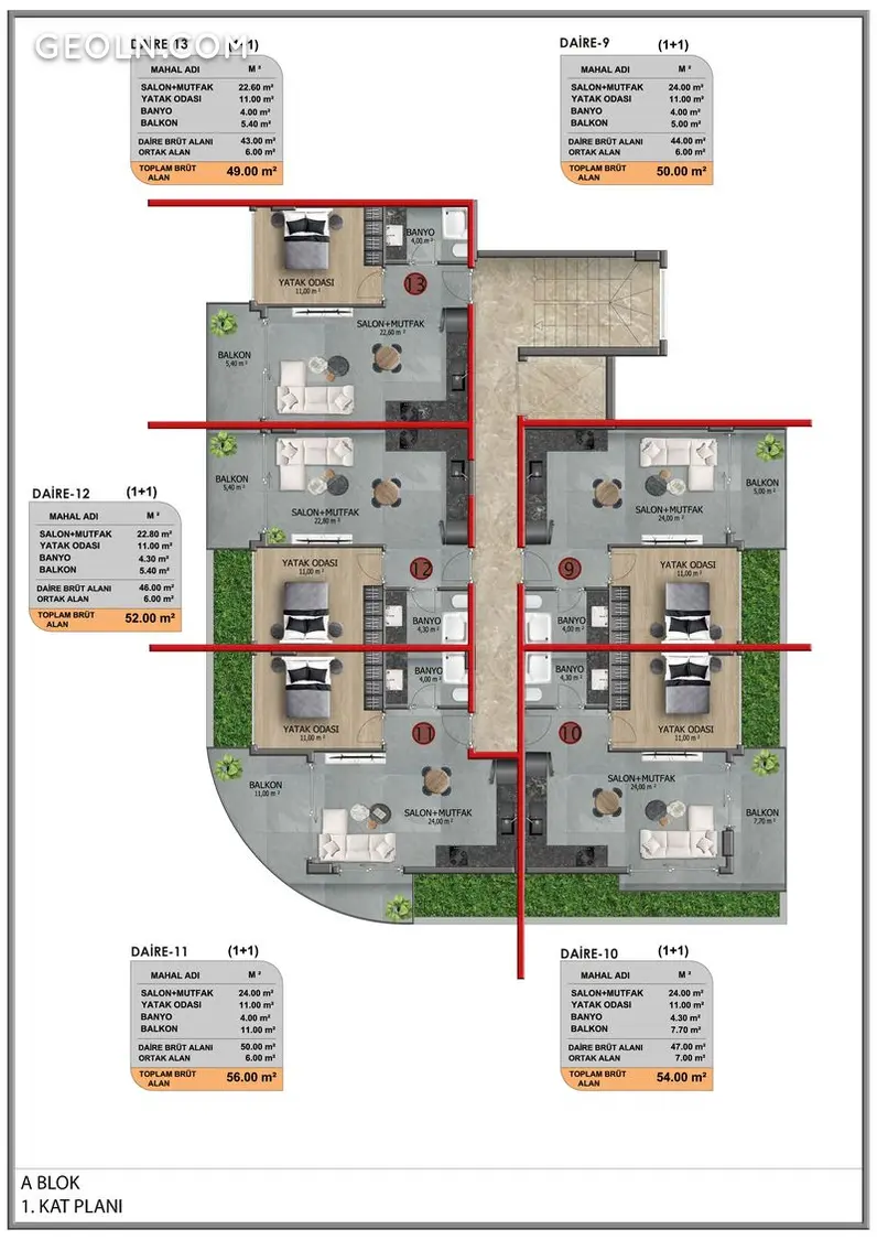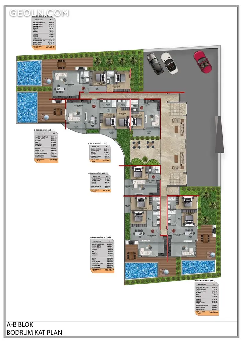 El complejo consta de 2 bloques, 46 apartamentos 1+1, 2+1 dúplex y 2+1 con piscina privada y terraza.