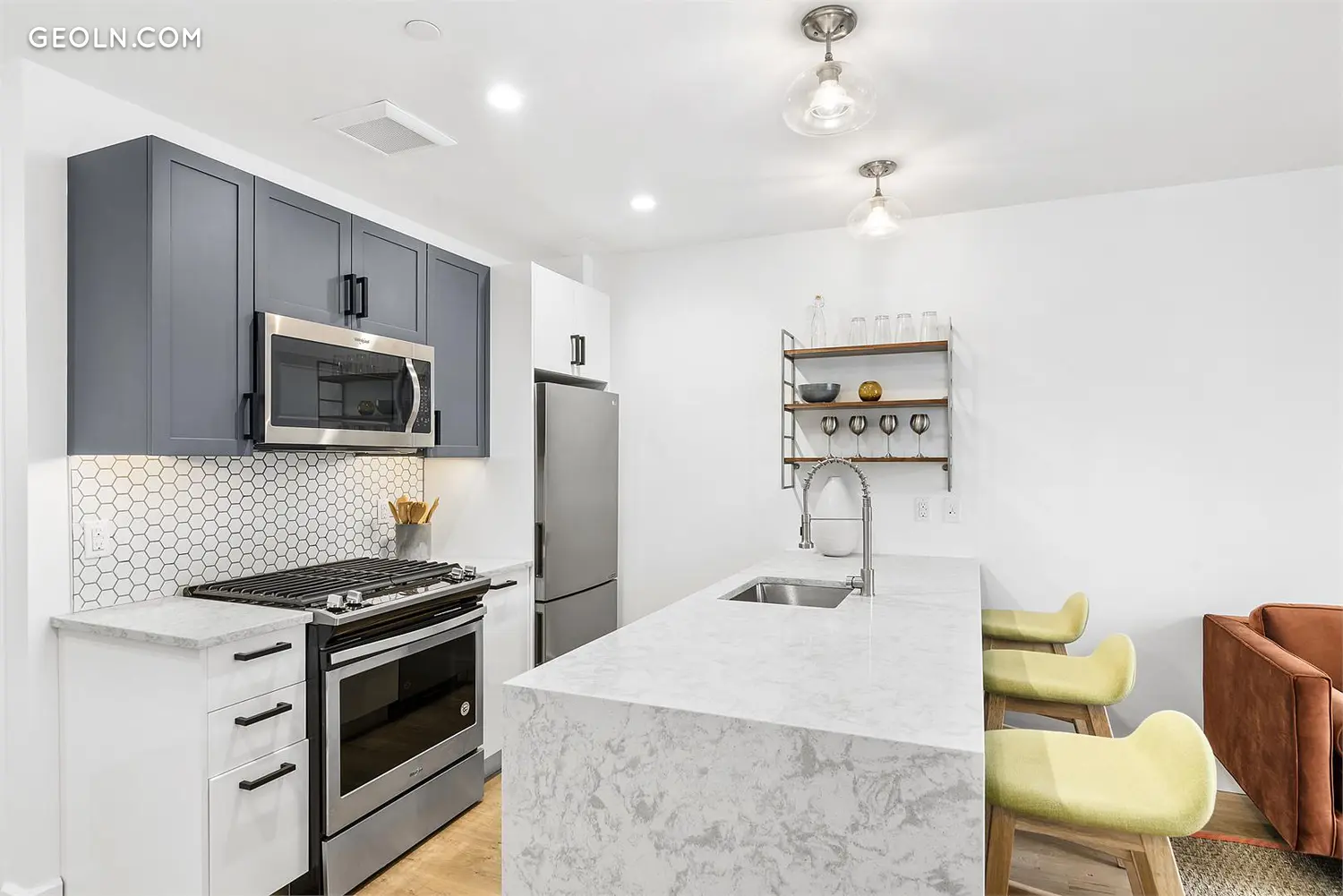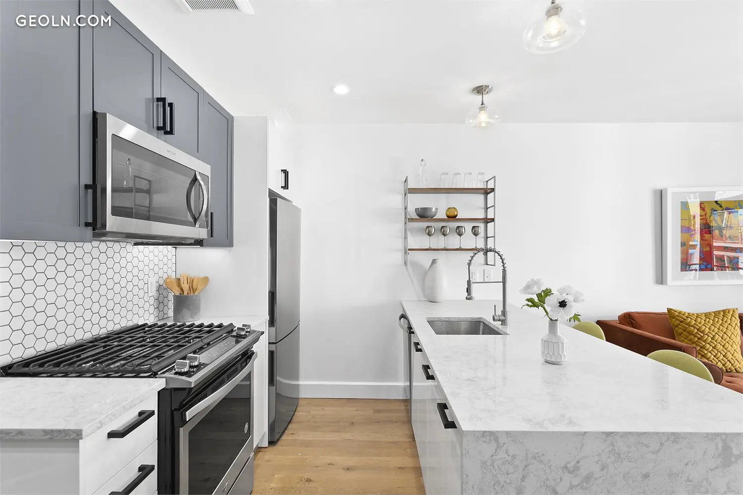 Las modernas cocinas abiertas están finamente elaboradas con laca blanca y gabinetes grises, herrajes negros mate, encimeras de piedra de cuarzo, isla de cocina con encimera en forma de cascada, placa para salpicaduras de color blanco en forma de panal, refrigerador LG de acero inoxidable, estufa a gas Whirlpool de 30 ', lavaplatos y microondas que se adaptan sin problemas para el entretenimiento y la vida diaria.