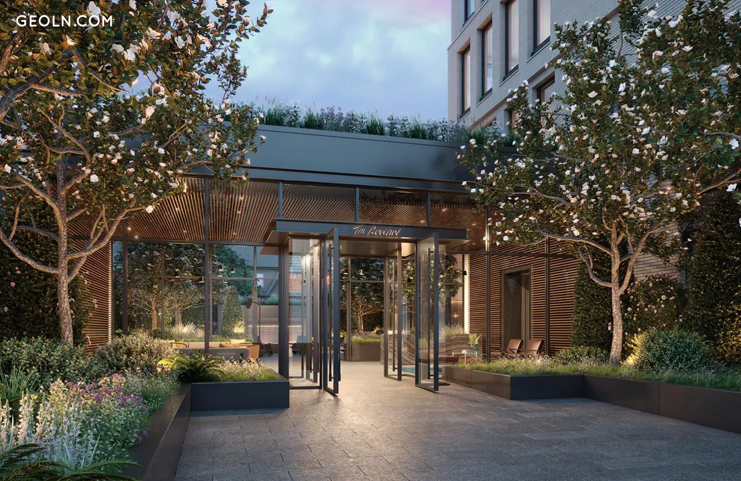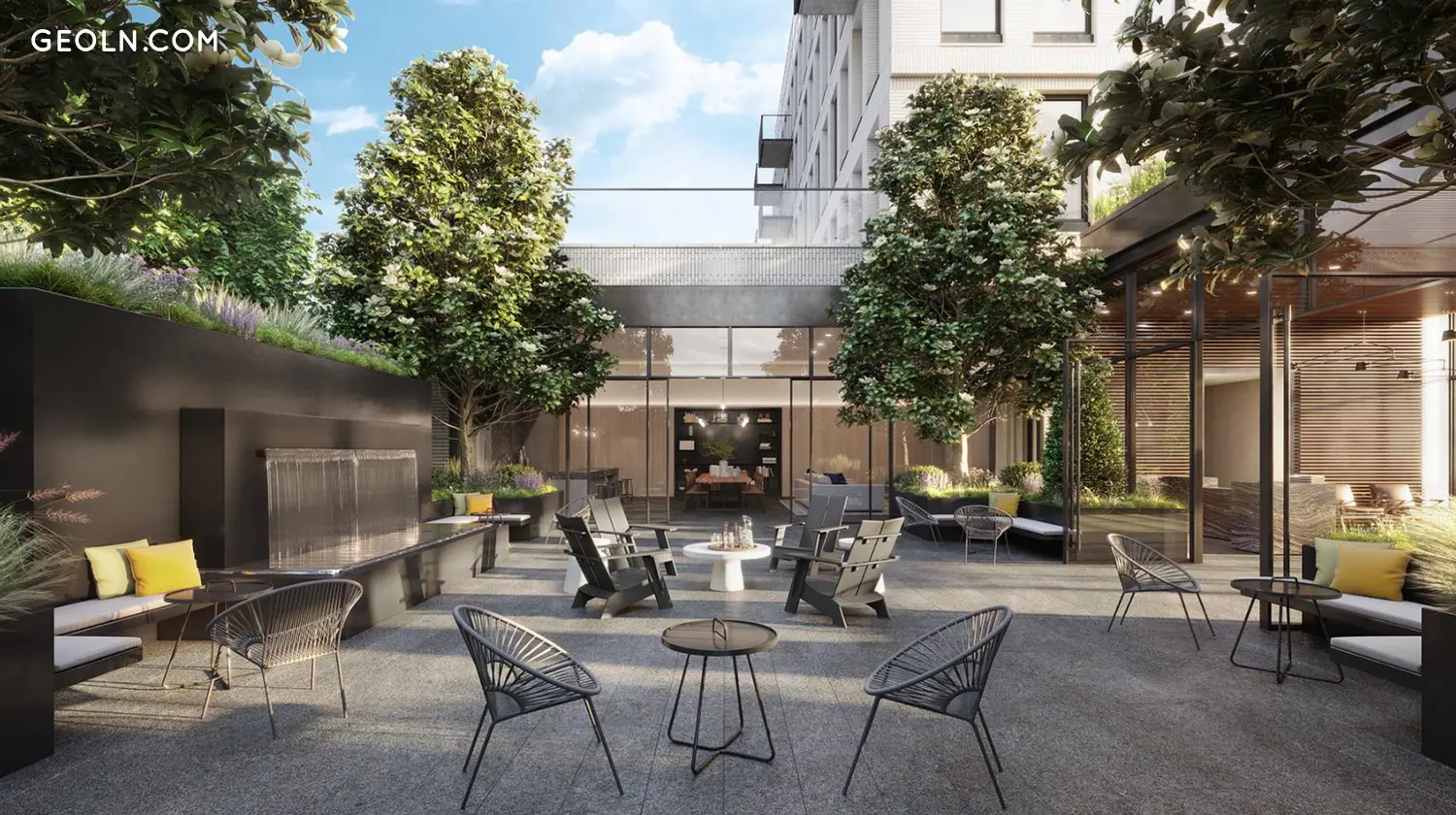 A su llegada, una zona verde saluda a los residentes e invitados, guiándolos hacia el Lobby de vidrio bañado por el sol mientras el mundo exterior se desvanece. El Jardín Sensorial se encuentra más allá, en el nexo del edificio, proporcionando un escenario perfecto para momentos contemplativos o reuniones sociales.
