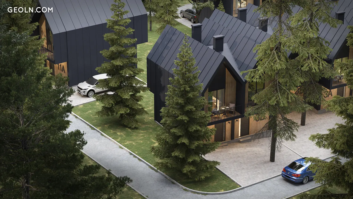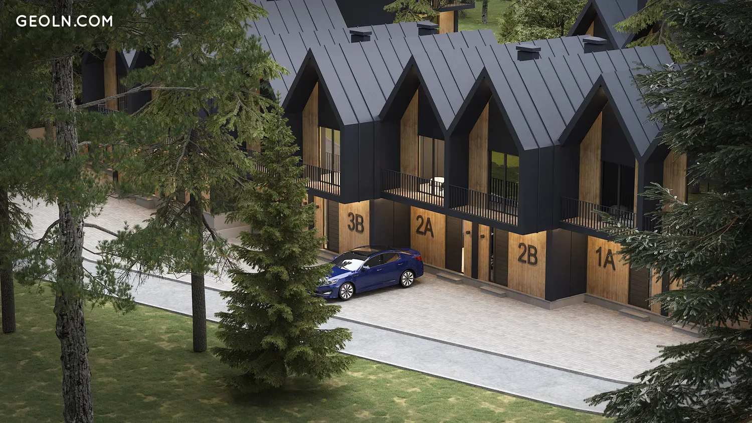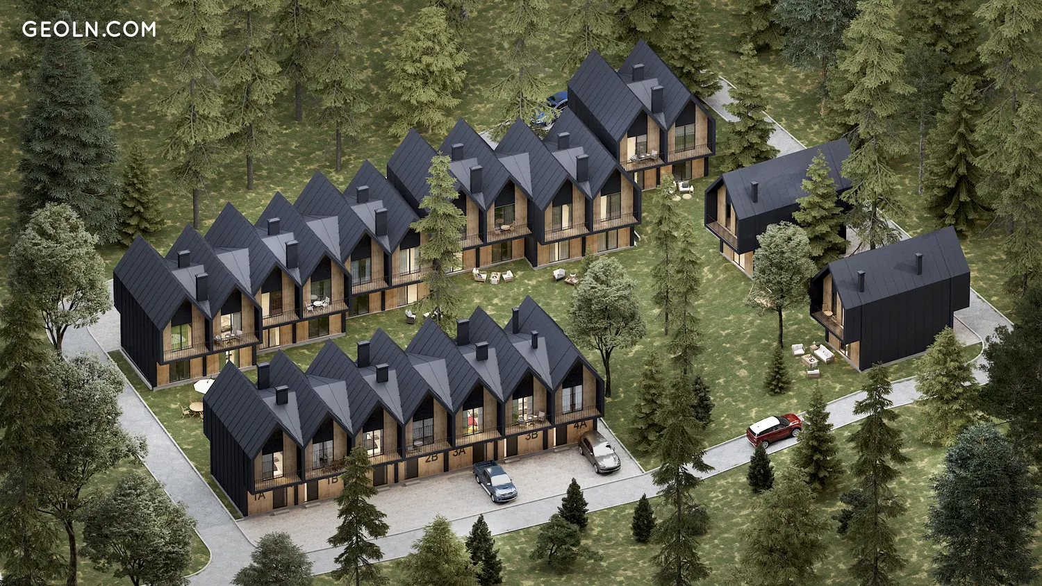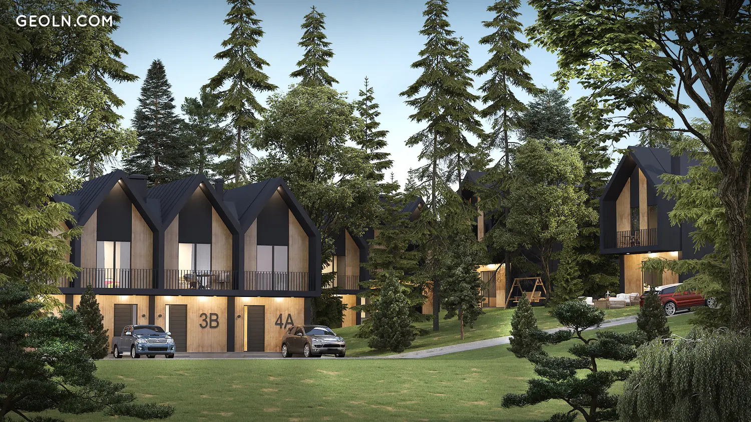 The Monsi Kokhta House, another project by Mons Jfuf, consists of 21 cottages in Bakuriani. The project features outdoor parking.