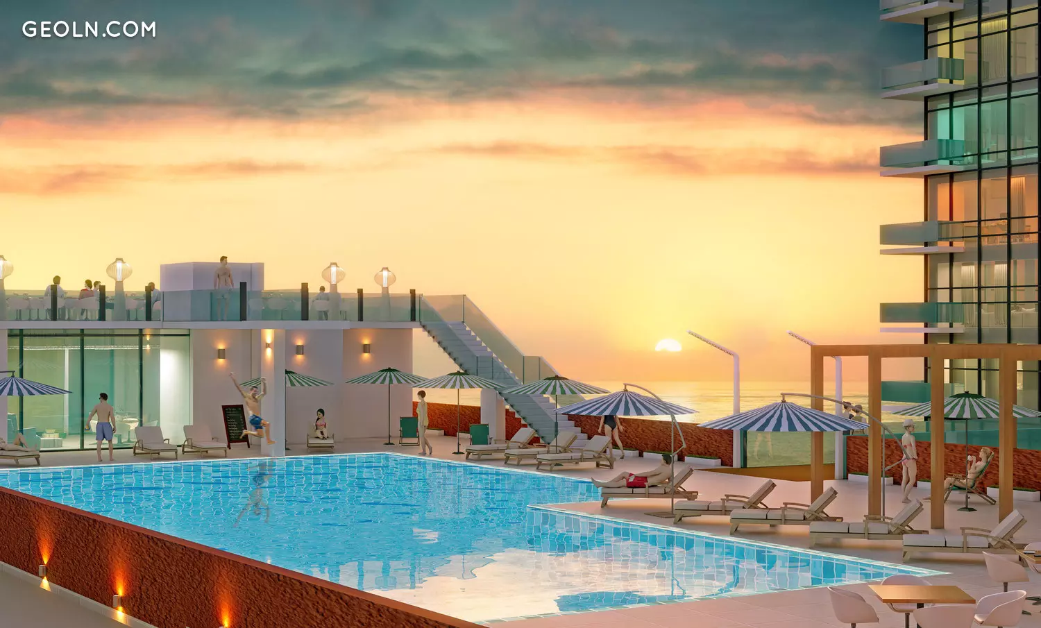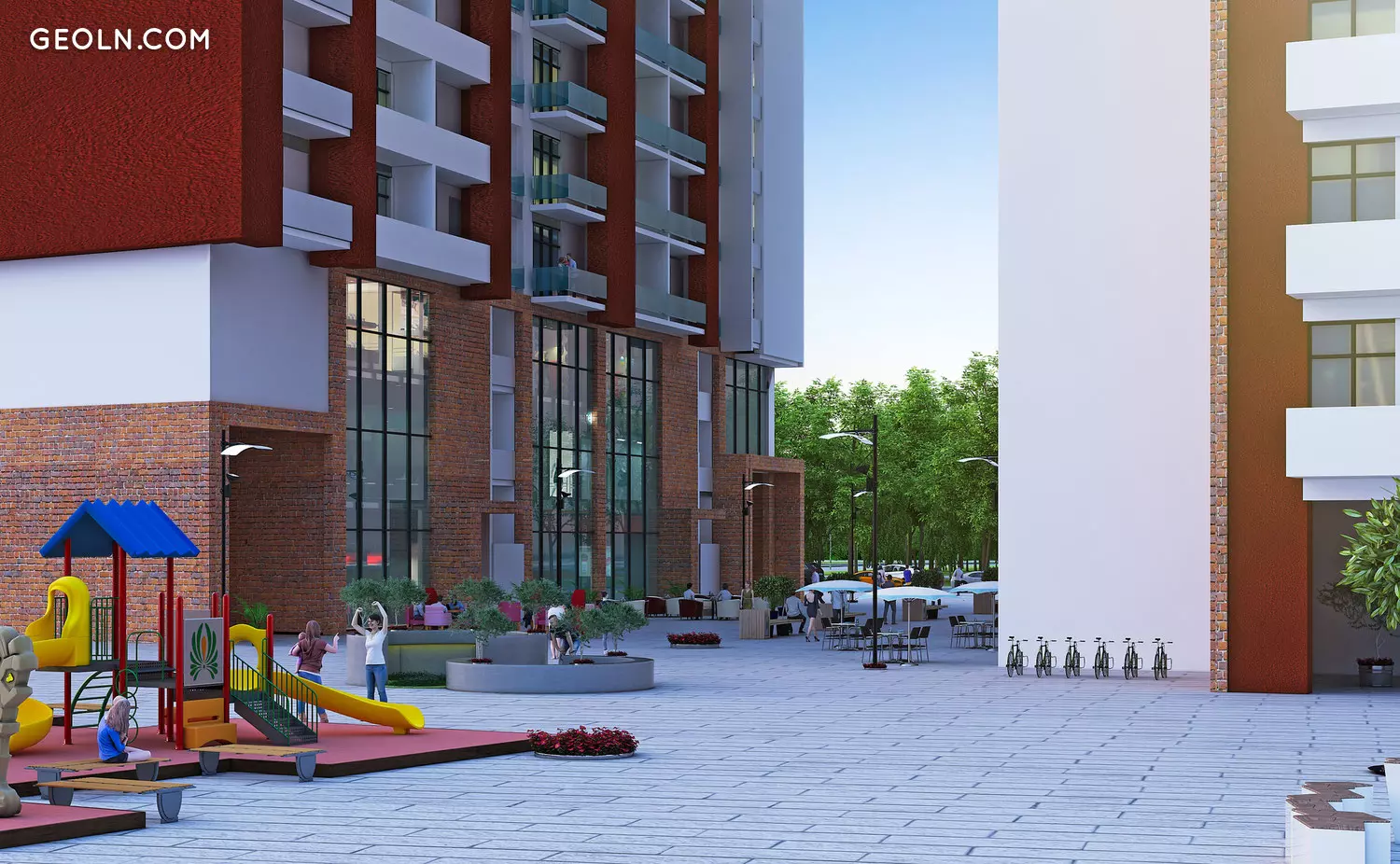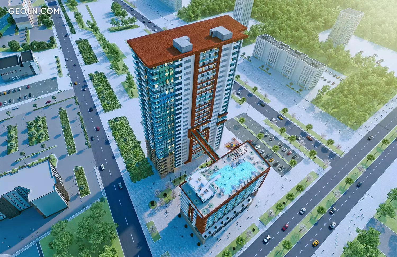 High-tech 27-storey apartment buildings; 11-story hotel; Underground and outdoor parking; Outdoor pool; Private courtyard with an area of 3724 m2