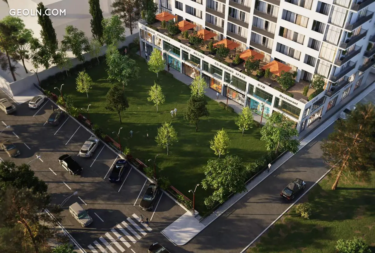 The lower floor is reserved for commercial premises such as cafes, pharmacies, shops, and more.