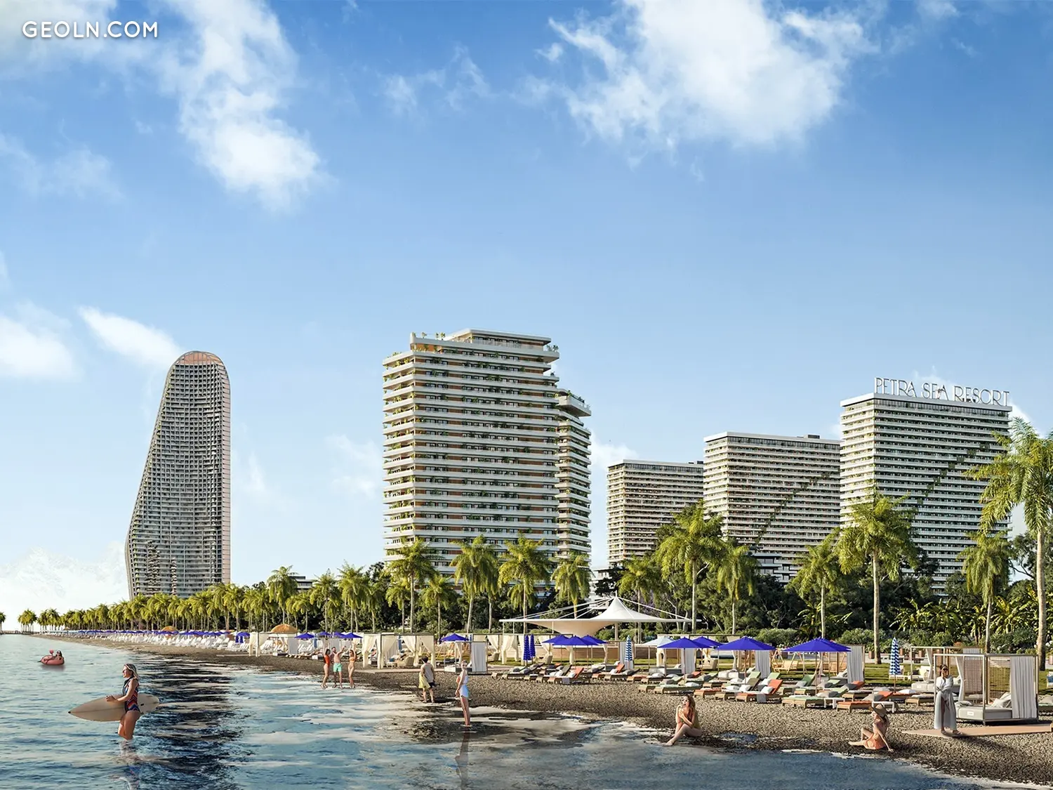 Triplet towers preside over a lush, palm tree lined waterfront setting, overlooking the Black Sea as well as the ruins of the ancient Petra fortress, which dates back to the 6th century.