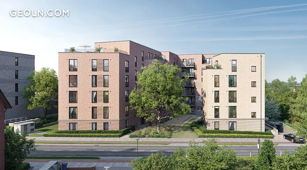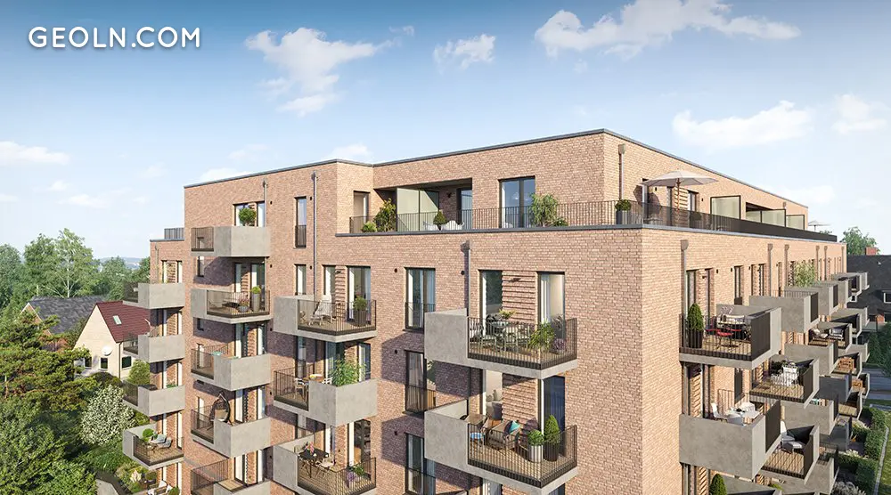 Hejmo consists of an L-shaped building and a solitary house on the property at Randstrasse 87-89 and houses a total of 49 condominiums. With its modern facade, Hejmo sets a new accent in the district. There is a communal green and play area on the property.