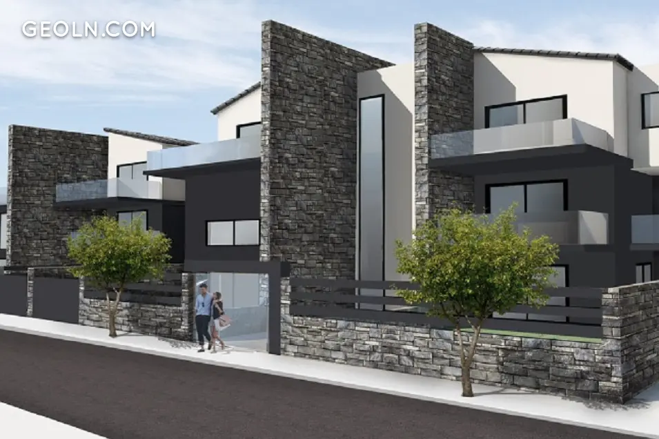 Modern residential building complex on a large corner plot. Independent properties with gardens for exclusive use. Patio inside a ground floor apartment, which extends around its perimeter. Overhead bridges – corridors inside the apartments with a clear view. The low height of the building complex gives the impression of a detached house. Exceptional design on the facades with vertical elements and stone cladding ensures privacy between the properties, while contributing to the unique architectural composition of the facades.