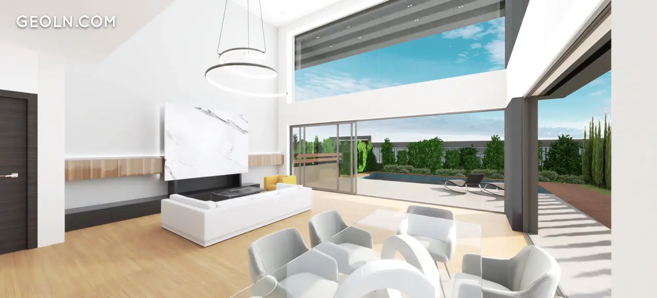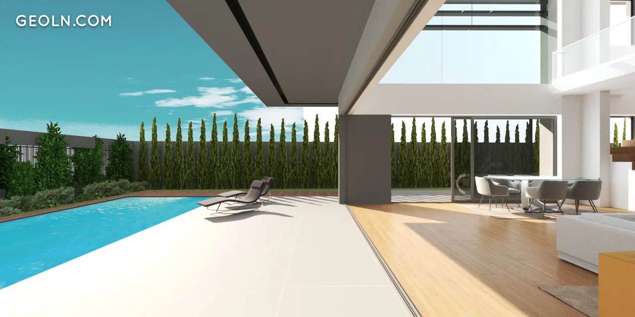 Two walls of windows in the living area let in maximum light and views of the private pool and gardens. Open the windows and the result is to create a seamless flow between indoors and the outdoor terrace area.