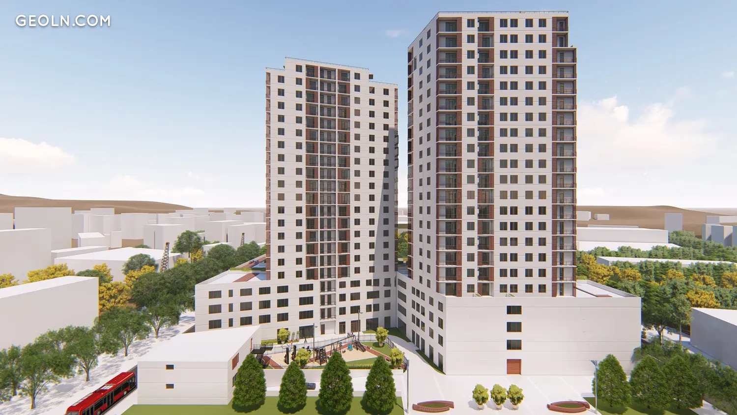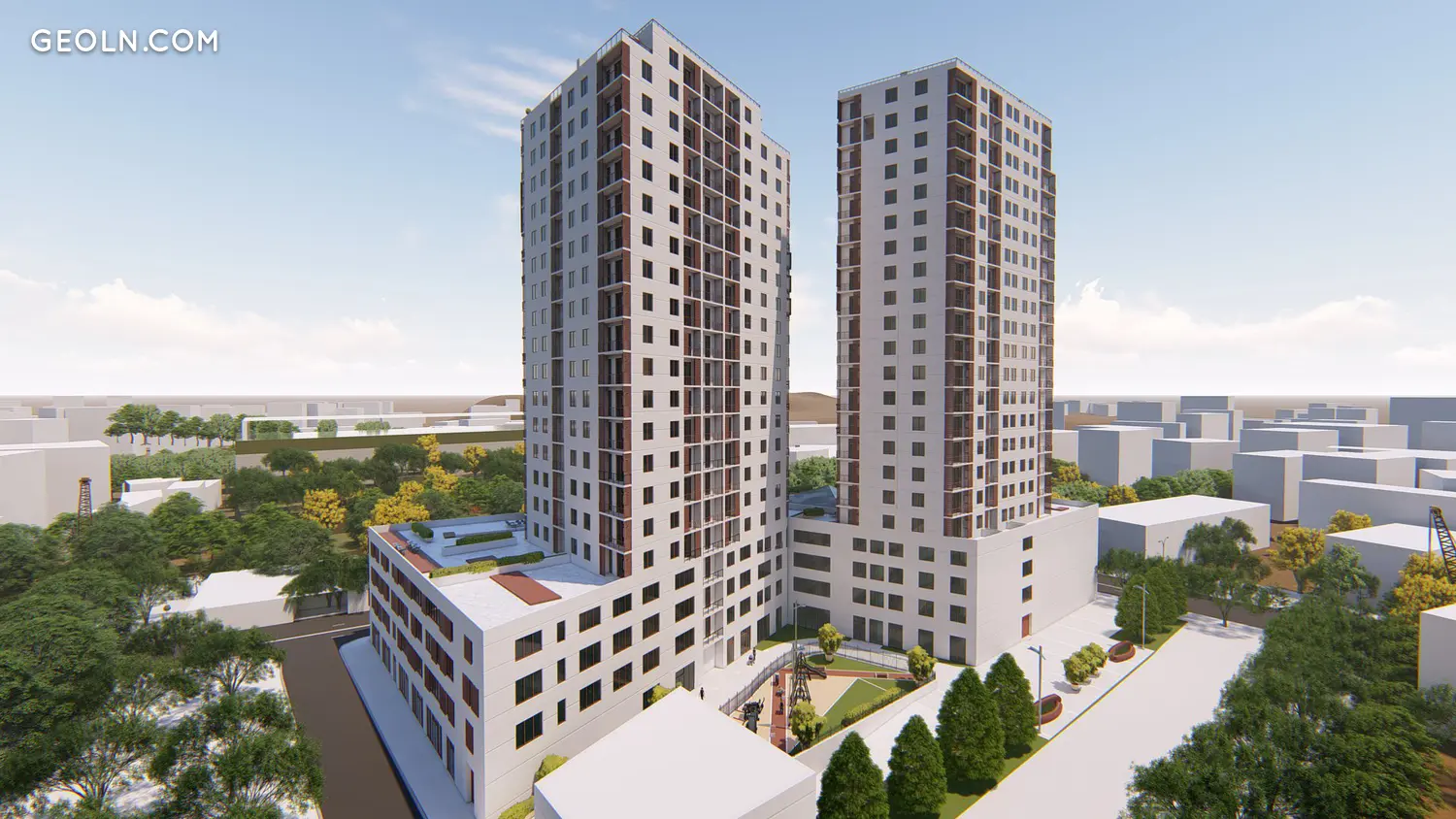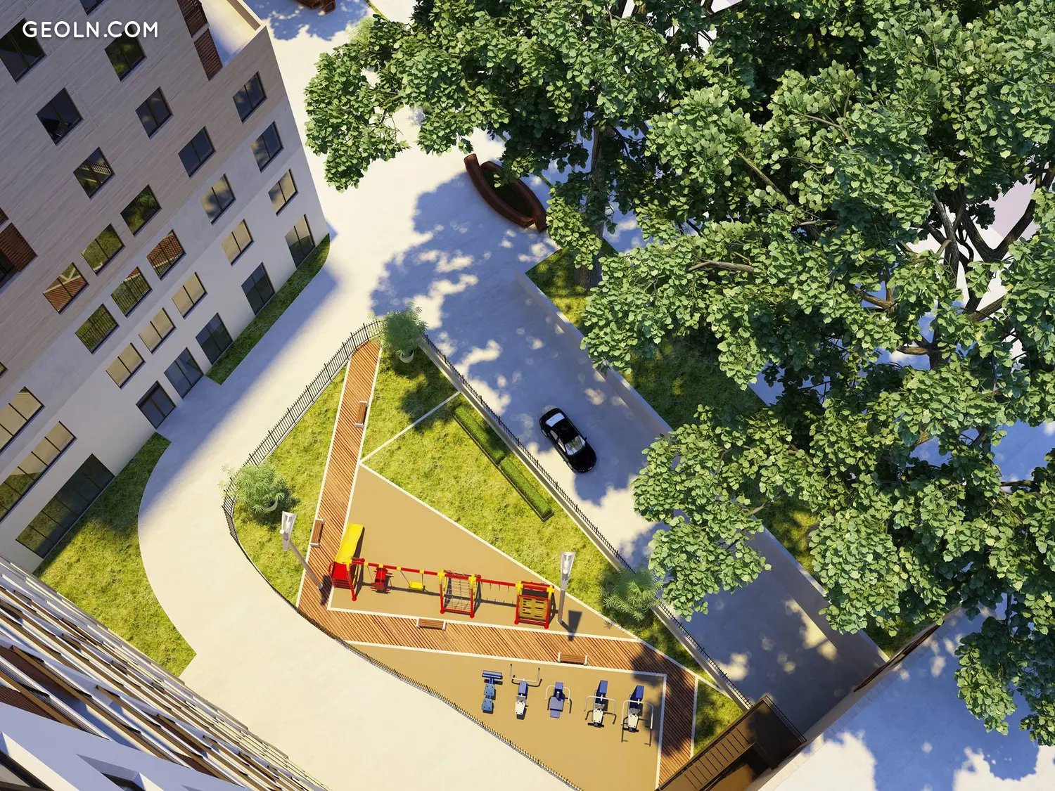 מגרש משחקים לילדים ומגרש ספורט עם ציוד אימון חיצוני ממוקמים בחצר. השטח מעוצב עם שבילי הולכי רגל ותאורת רחוב.