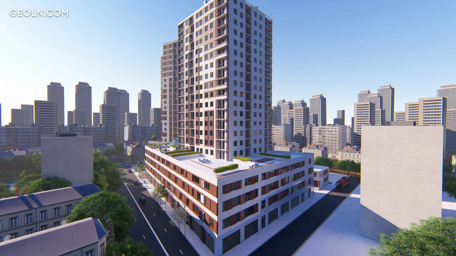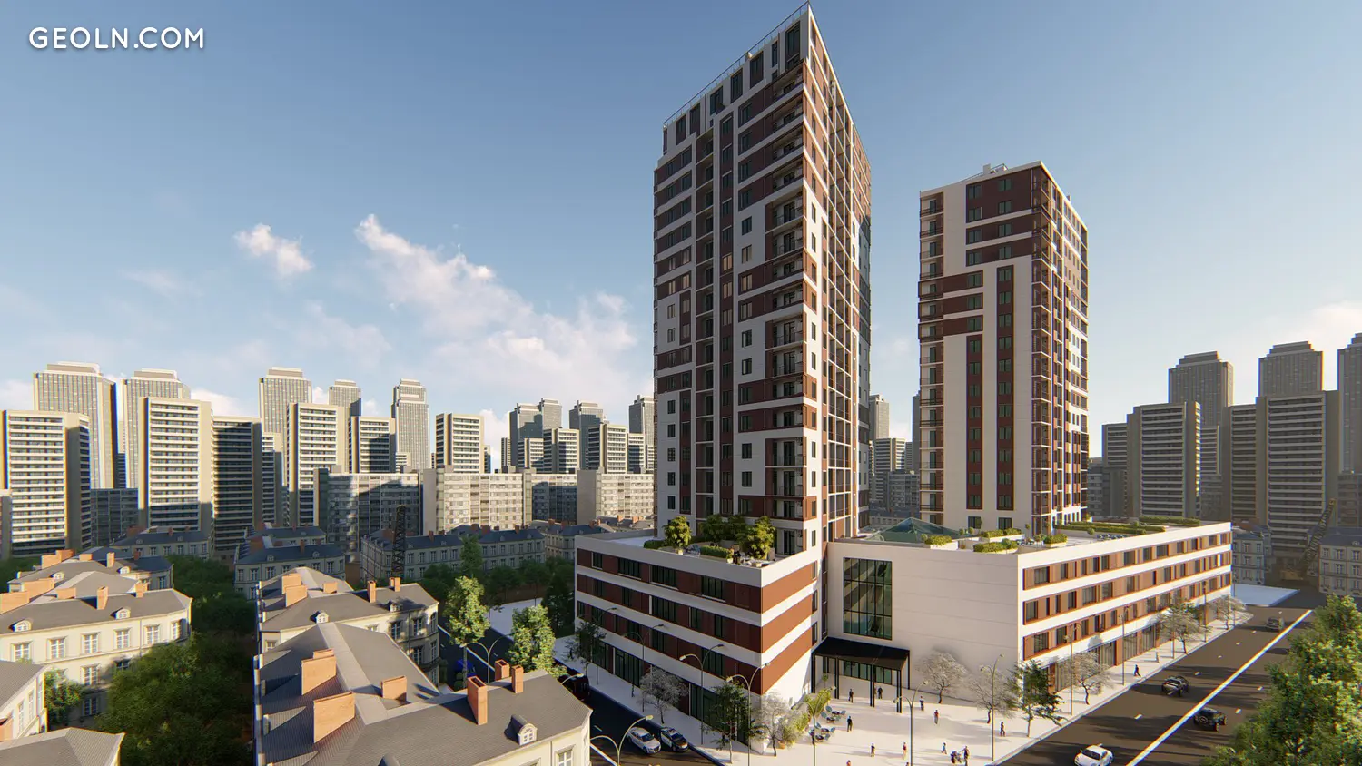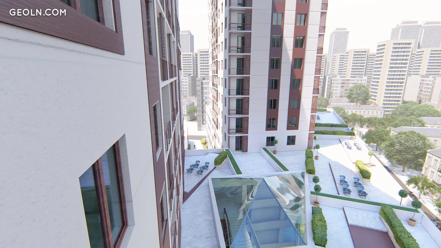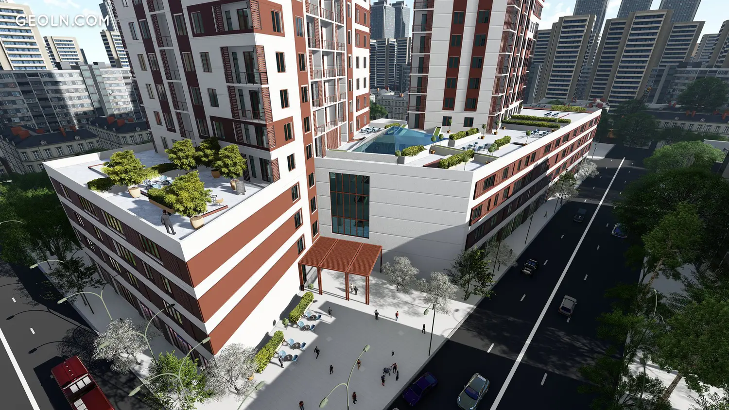 מגרש משחקים לילדים ומגרש ספורט עם ציוד אימון חיצוני ממוקמים בחצר. השטח מעוצב עם שבילי הולכי רגל ותאורת רחוב.