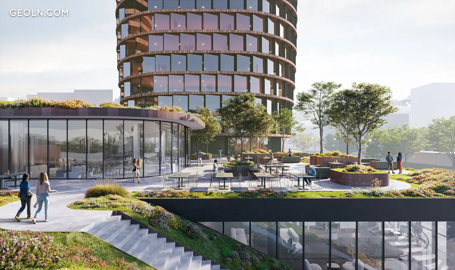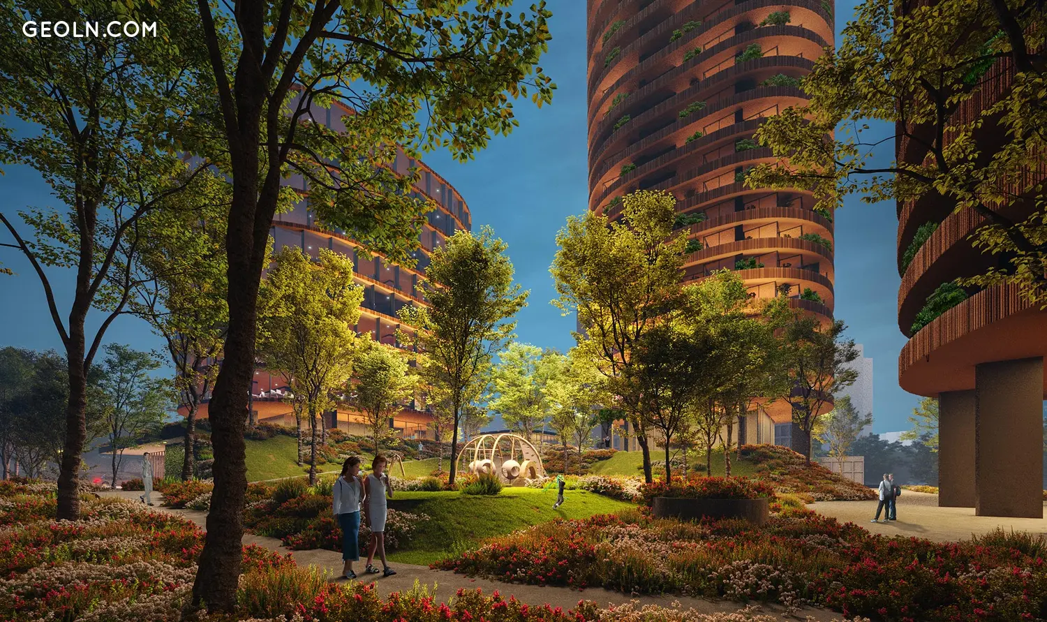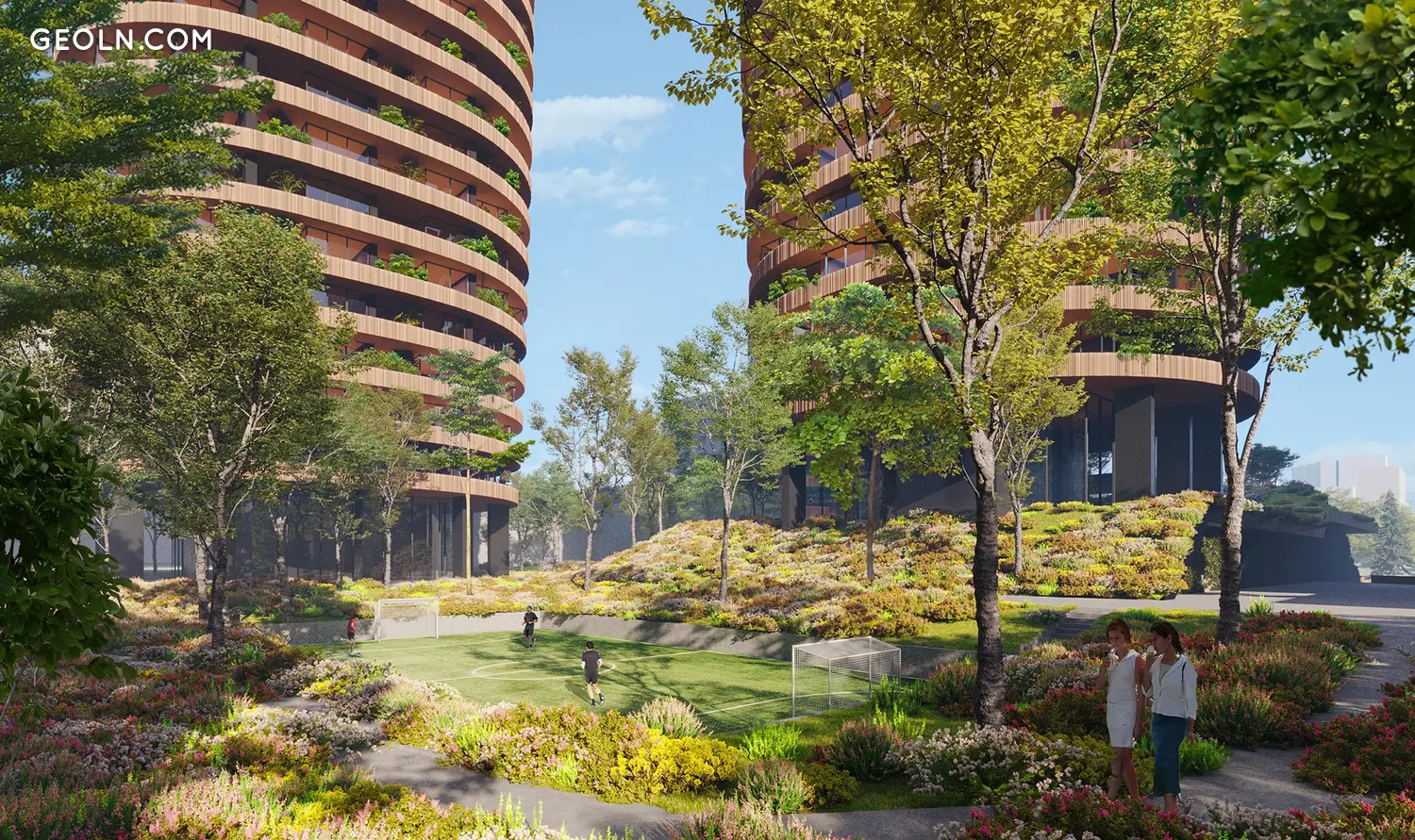 המרפסת המוצלת על גג הקומה הראשונה של הקומפלקס משתלבת בחצר עם עיצוב מבריק, המשתרע על פני 3000 מטרים רבועים. האזור הירוק כולל מגרש משחקים, אזור מנוחה, אצטדיון רב-תכליתי ונתיב אופניים, ומציע לדיירים מנוחה מההמולה של הסביבה העירונית התוססת.