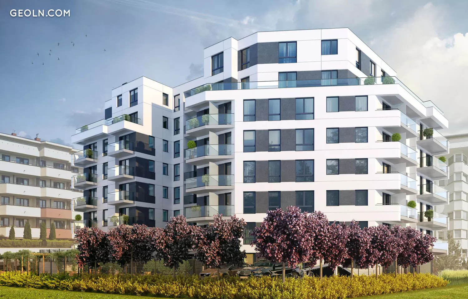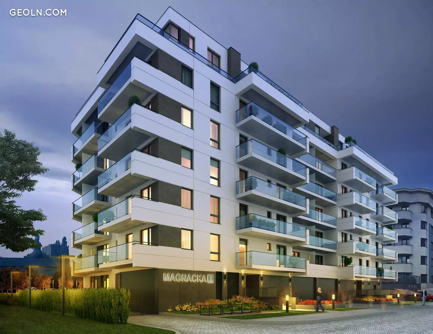Magnacka 1 הוא בניין בן 6 קומות עם עיצוב מודרני, צבעים בהירים בשילוב של גוונים של לבן ואפור.