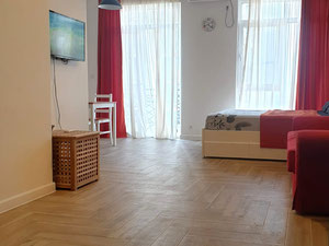 הדירה בשטח גדול של 99 מ"ר בקומה ה-5. תכנון נוח עם מטבח-סלון מרווח עם שני חלונות פנורמיים, שתי חדרי שינה גדולים, שני חדרי שירותים, מסדרון נוח ושני מרפסות. הדירה במצב "שלד שחור". יש לה נוף ייחודי לים ולהרים.